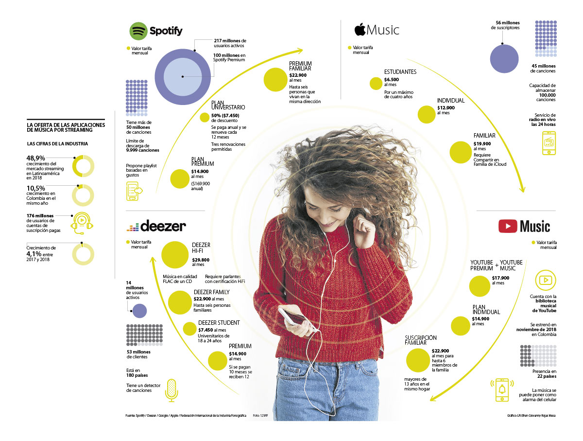 Esta industria, liderada en el país por Spotify, Deezer, Apple Music y el recién llegado YouTube Music, ha tenido tal auge que en un año vio un crecimiento de 48,9% en Latinoamérica y de 10,5% en el país, según los datos de la Federación Internacional de la Industria Fonográfica hasta 2018.