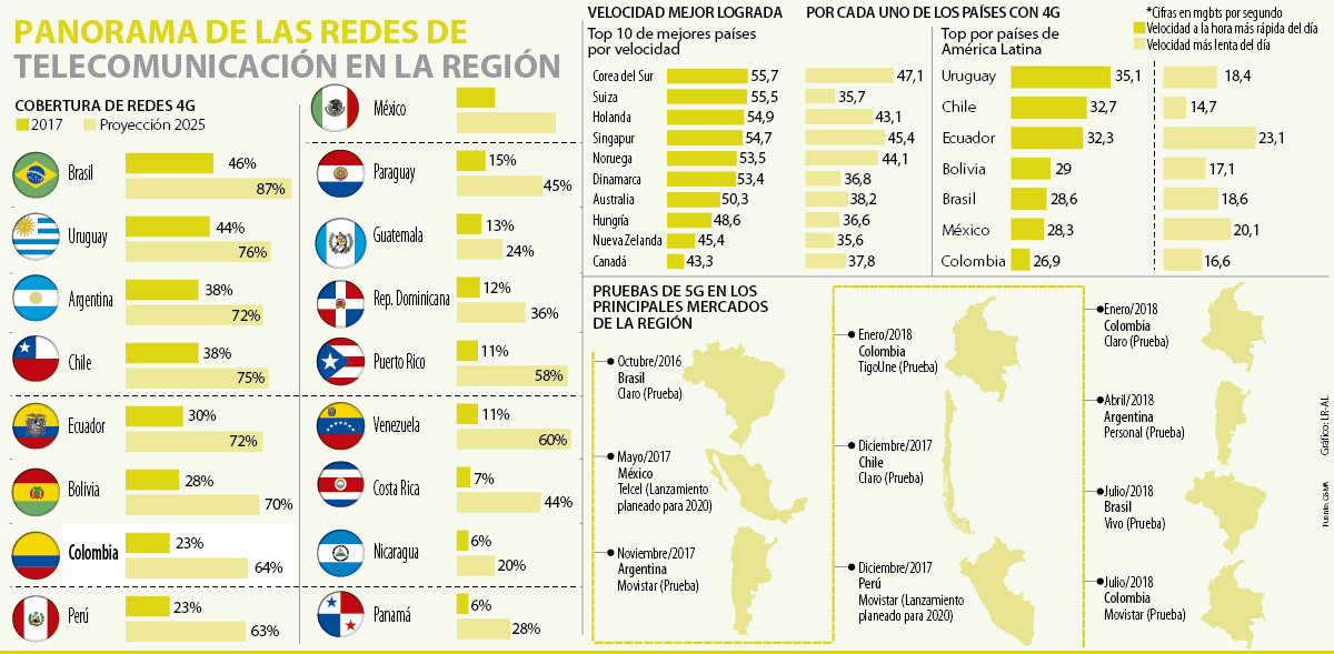 El segundo punto es que aunque en América Latina los operadores móviles ya empezaron pruebas de 5G, (incluido Colombia) hay que aclarar que a 2020 solo 300.000 conexiones en América Latina tendrán acceso al 5G, es decir, solo 3% de la población se vería beneficiada. Además, se proyecta que en 2022 subiría a 5% de los habitantes gracias a 2,5 millones de redes con esta ultra velocidad.