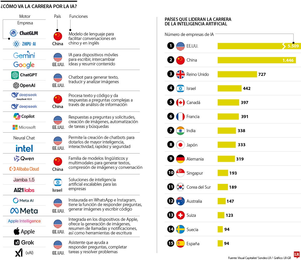 Estados Unidos es la empresa que cuenta con el mayor número de empresas de IA: tiene alrededor de 5.509, según Visual Capitalist, razón por la que es el país líder en el mundo. Sigue China, Reino Unido e Israel con 1.446, 727 y 442 empresas, respectivamente. Carlos Alberto Parra, docente de la Facultad de Ingeniería de la Universidad Javeriana, dijo que el desarrollo de herramientas de inteligencia artificial generativa se ha acelerado por las iniciativas de países que han demostrado nuevos avances tecnológicos.