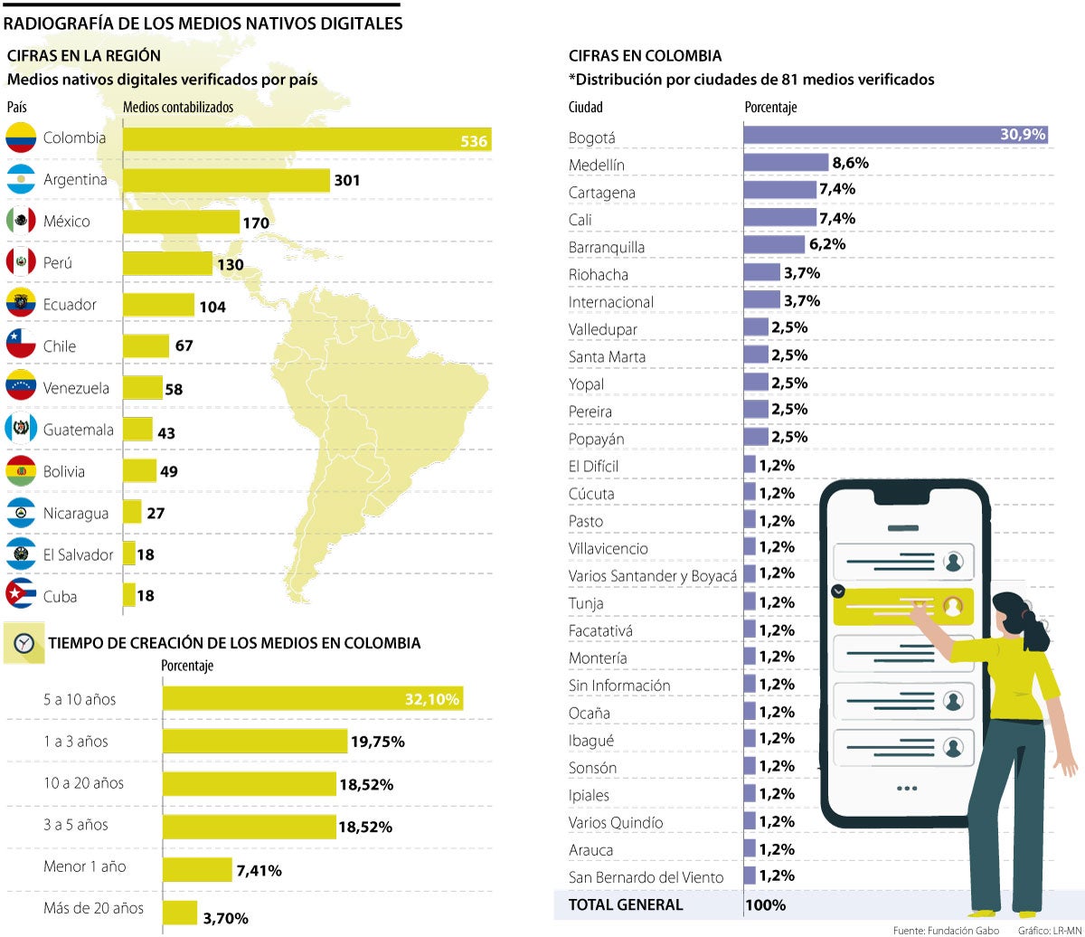 El más reciente informe sobre este tema fue realizado por la Fundación Gabo de Periodismo. Bautizada como ‘El Hormiguero’, la publicación encontró que Colombia cuenta con 536 medios nativos digitales verificados. El estudio arrojó que el país es el que tiene el mayor número de estos sitios web de comunicación en la región: en segundo lugar está Argentina, con 301 medios, seguido de México con 170. Perú (130), Ecuador (104), Chile (67) y Venezuela (58) siguen en el listado.