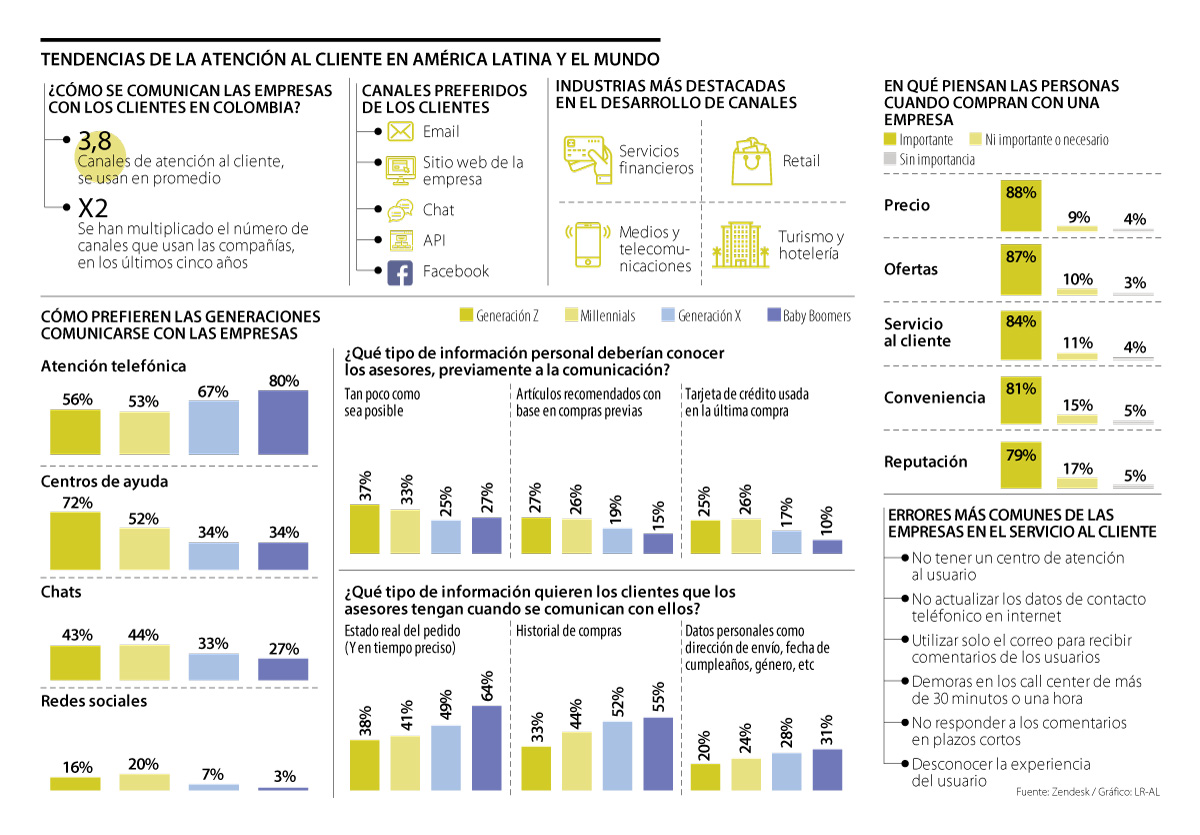 En promedio, la mayoría de las empresas ofrecen casi cuatro canales de atención al usuario, siendo las que más están trabajando en este punto las firmar relacionadas con servicios financieros, retail, medios y telecomunicaciones, turismo y hotelería. Según Zendesk los consumidores en Colombia prefieren comunicarse con las empresas vía email y el sitio web de la empresa.