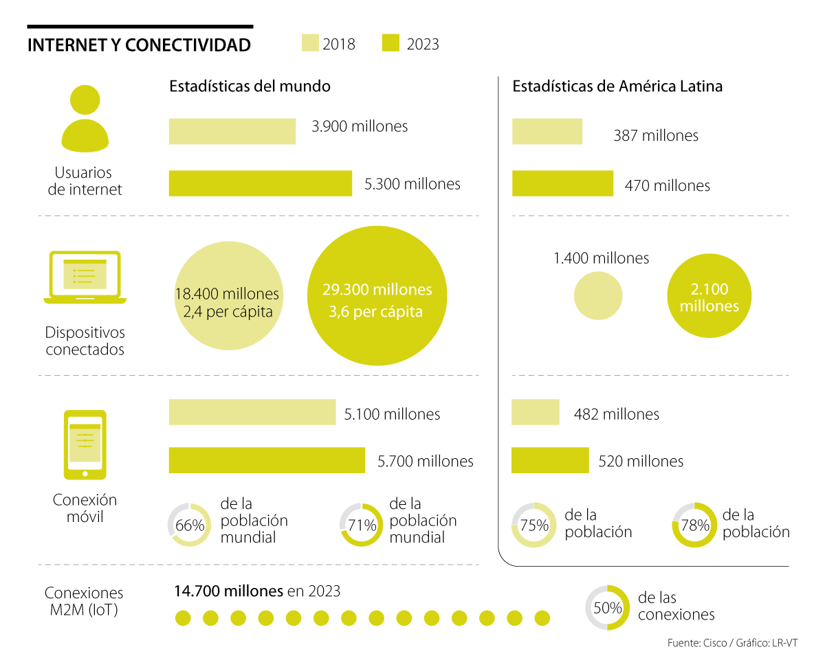 Un informe de Cisco pronosticó que para ese año habrá 5.300 millones de usuarios de internet, equivalente a 66% de la población