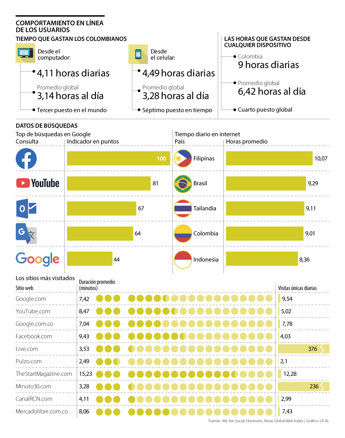 El ranking de tiempo en línea es liderado por Filipinas, un promedio de 10:07 horas diarias en internet; le sigue Brasil con 9:29, Tailandia 9:11 e Indonesia, por debajo de Colombia, con 8:36 horas al día.