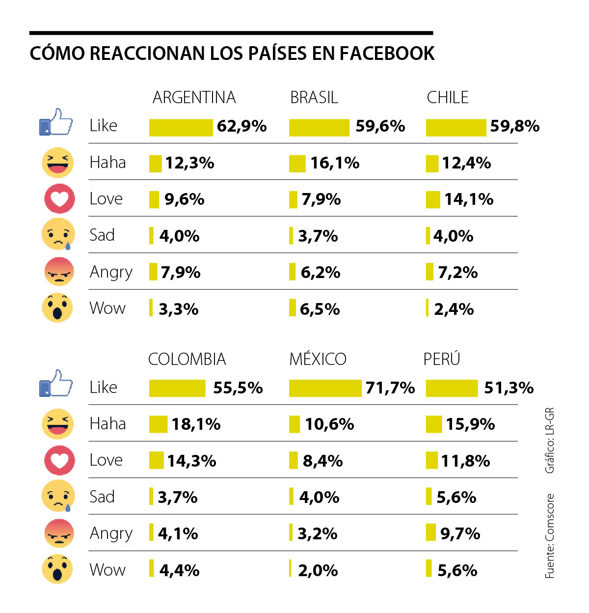 En el caso del me gusta, México es el país donde más se usa esta reacción, que equivale a 71,7% del total de las interacciones, mientras que me enoja y me entristece son más usados en Perú que en otros países.
