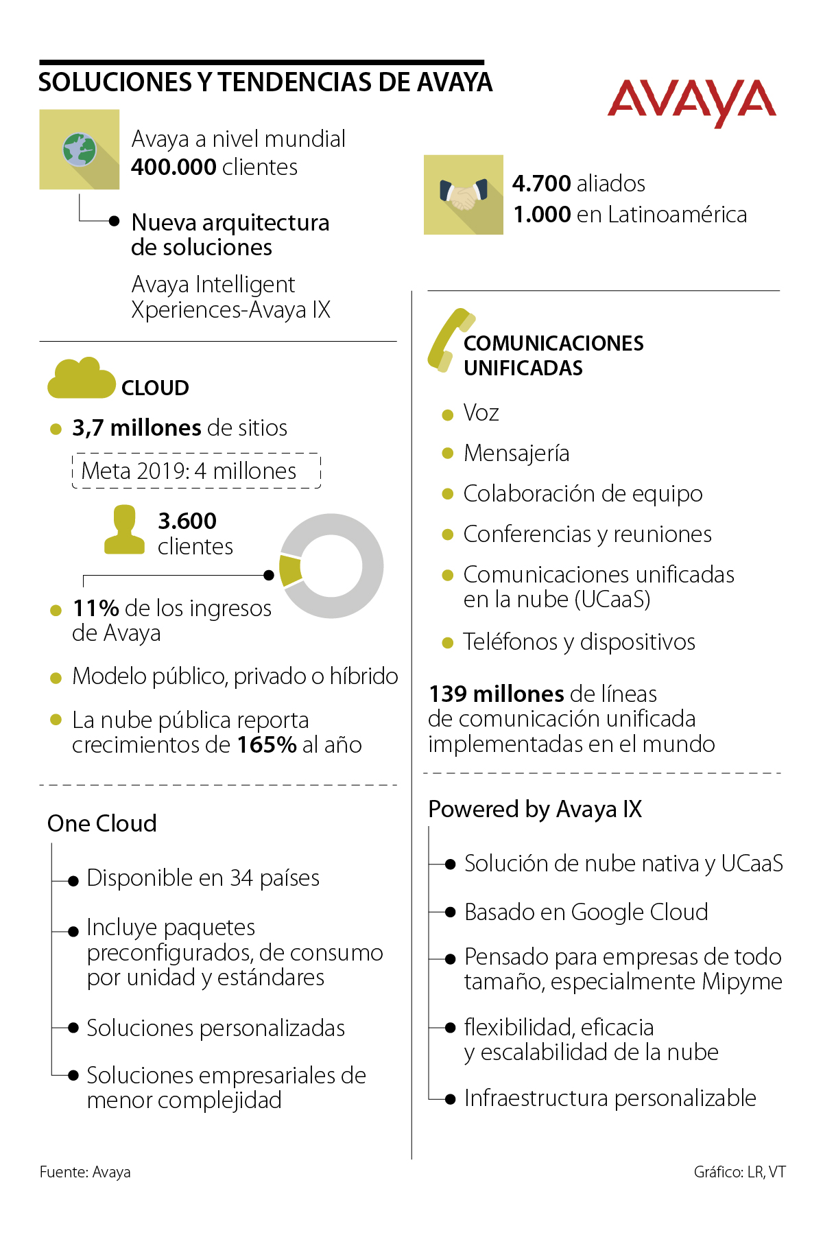 Actualmente, Avaya cuenta con 3,7 millones de puestos en la nube, y la meta de la compañía para este año es llegar a cuatro millones. La última innovación en este segmento es One Cloud, un servicio que presentó la compañía este año, el cual ya está disponible en 34 países y llegará a Latinoamérica antes de que finalice el año.