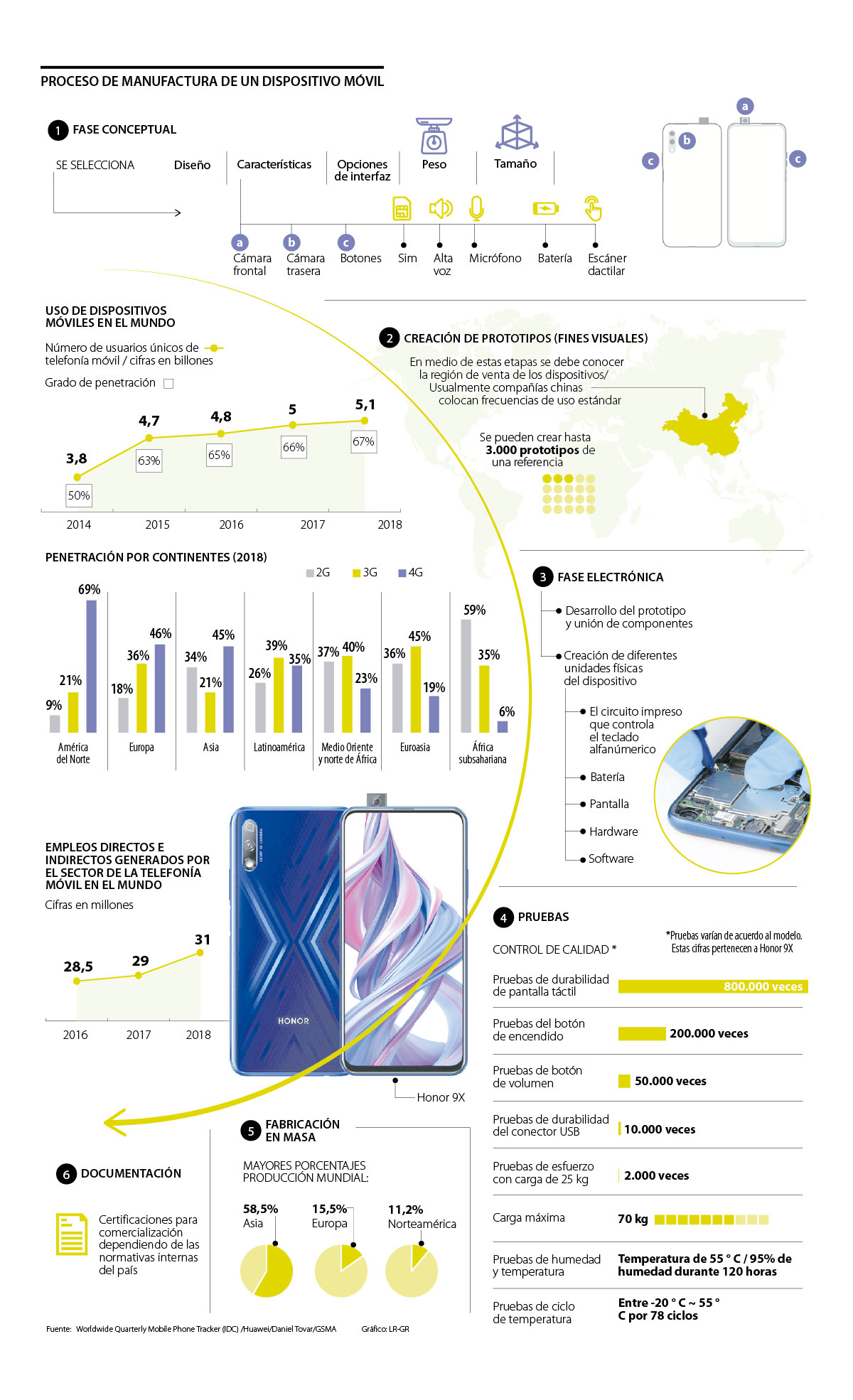 Más allá de las fases iniciales, los dispositivos también deben pasar por una etapa de control de calidad. Por ejemplo, Honor, la submarca de Huawei que llegó al país hace cerca de un año, reveló la cantidad de testeos por los que tiene que pasar el dispositivo para satisfacer las necesidades del cliente. Entre ellas se encuentran pruebas que superan las 800.000 repeticiones. El proceso termina con la fabricación en masa y la documentación necesaria para su comercialización.
