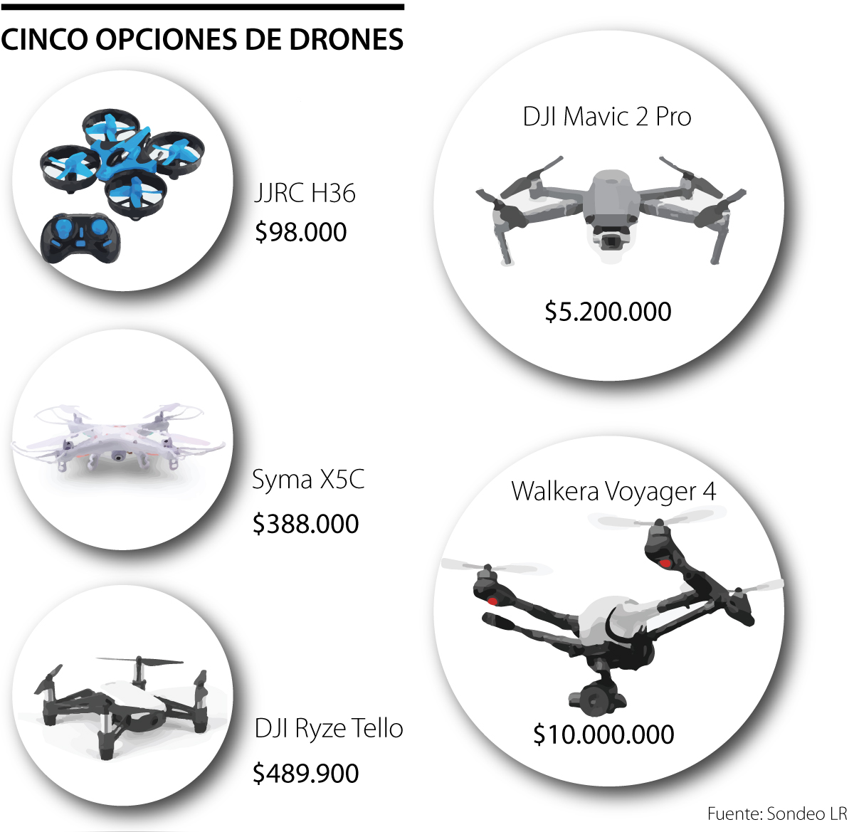 Empezando por el más económico, el mercado ofrece el modelo JRC H36, pensado para los amateurs en el pilotaje de estos vehículos. Se puede conseguir por $98.000 en plataformas como Mercado Libre o Amazon. Aunque no tiene cámara y es bastante pequeño, esta herramienta puede entrenarlo para entender cómo funcionan estos aparatos, si a futuro piensa en costear uno con mayor precio.