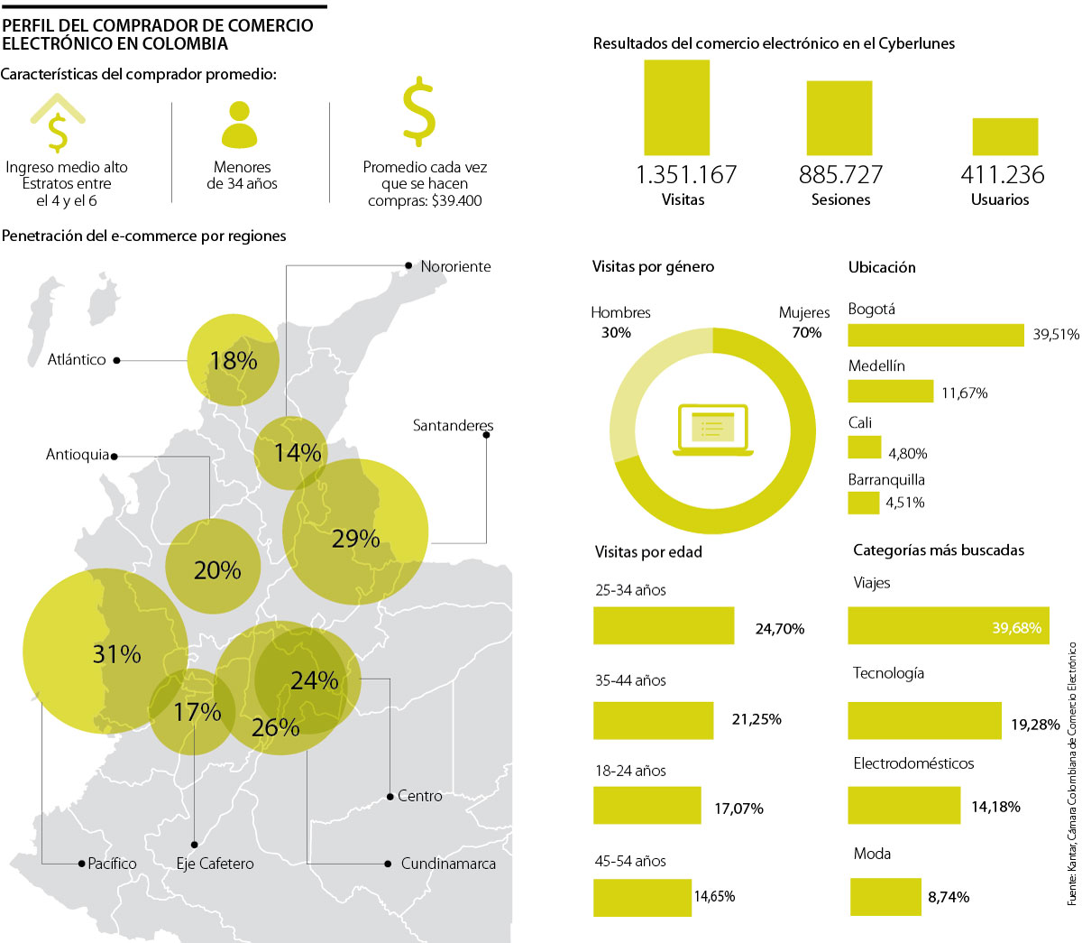 “Debido a la densidad poblacional, Bogotá es la ciudad donde más se compra a través de comercio electrónico, seguido por Medellín y Cali. Esto se ve reflejado en las visitas recibidas en la última jornada de Cyberlunes donde los porcentajes de sesiones al sitio fueron las siguientes: Bogotá (39,51%), Antioquia (15%,3%), Valle del Cauca (8,7%) y Atlántico (4,8%)”, señaló Quiñones.