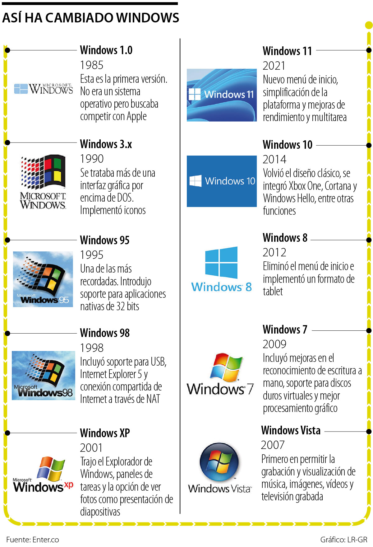 Esta nueva versión contrasta con lo que el mercado vio por primera vez en 1985, cuando se presentó la versión Windows 1.0, la cual era comprendida como un sistema gráfico de 16 bits que intentaba implementar, por primera vez, un ambiente operativo, pese a que para entonces Apple ya empezaba a salir al mercado.