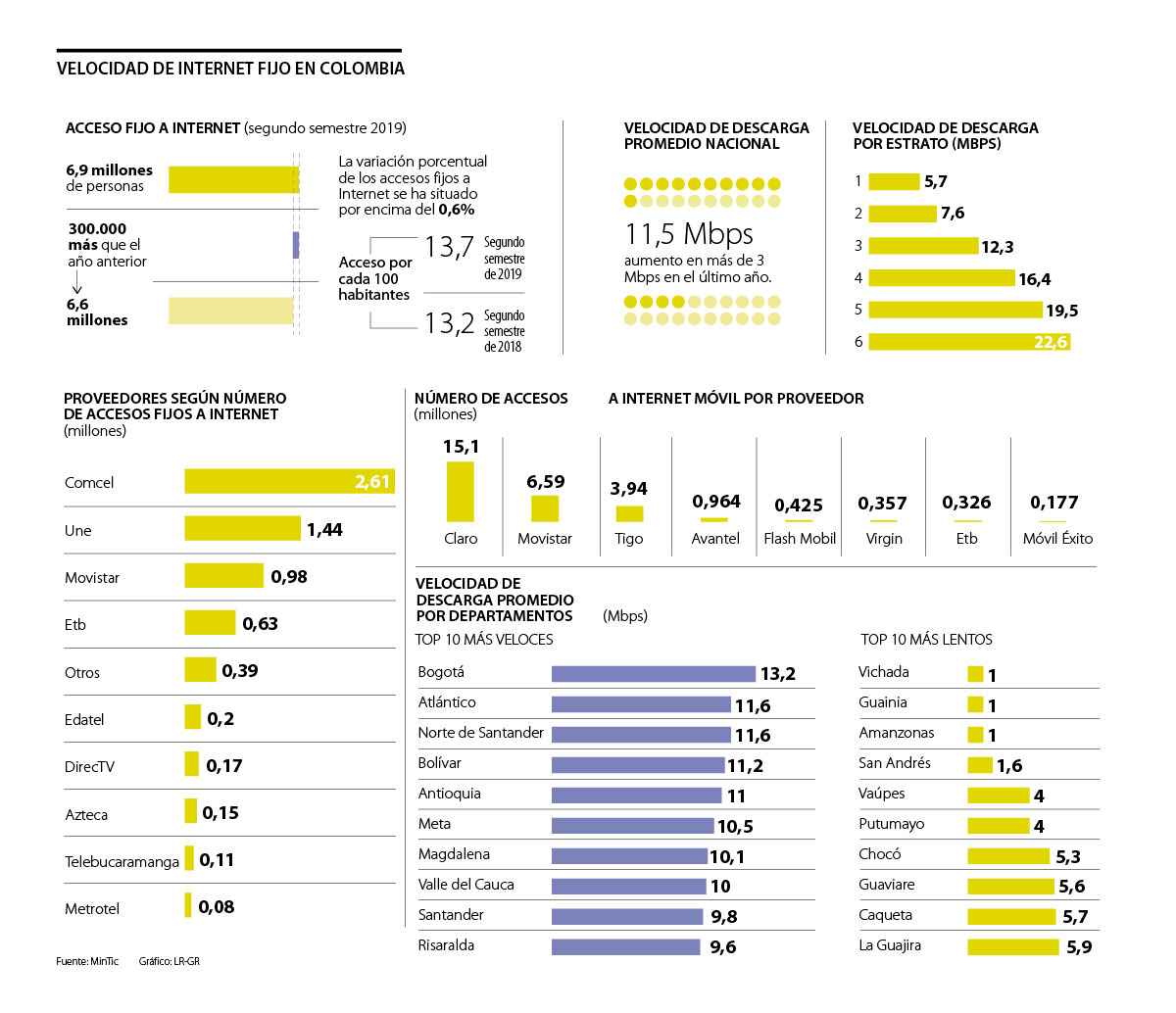 Si bien la tarea en cobertura se ha hecho, se presenta un retraso en la velocidad de descarga en varios departamentos del país. La velocidad de descarga promedio de internet fijo en el segmento residencial se ubicó en 10,8 Mbps. Sin embargo, territorios como Vichada, Guainía, Amazonas y San Andrés la velocidad de descarga es entre 1,0 Mbps y 1,6 Mbps, por lo que entrar a páginas pesadas o videos de alta calidad serán lentas al cargar.