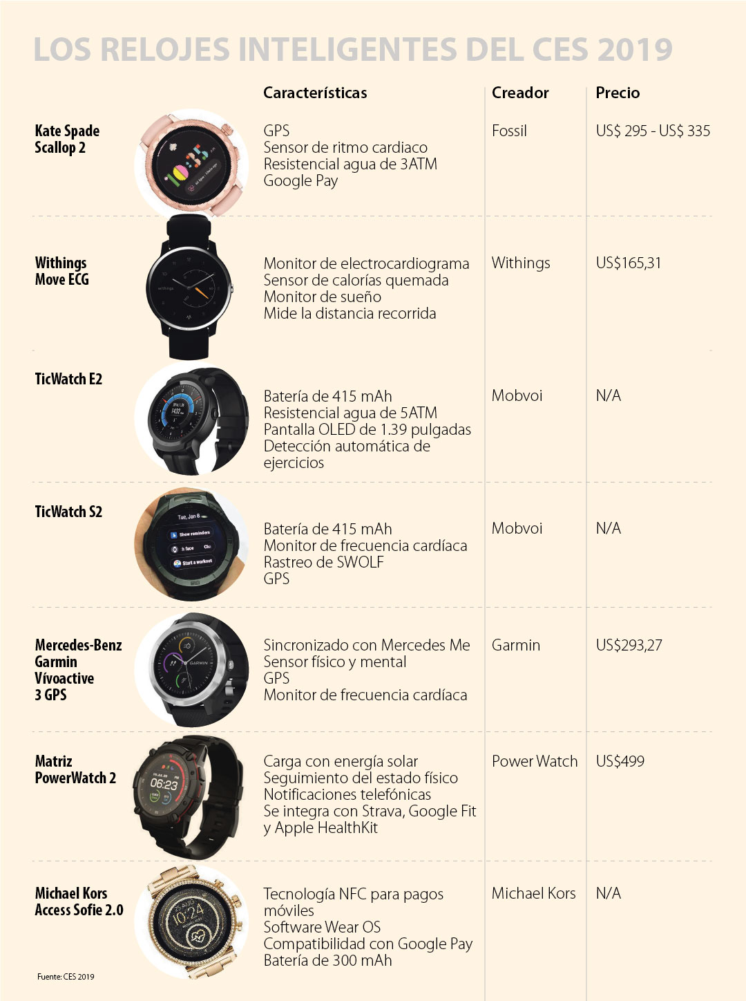 Este año, no se podían quedar atrás las compañías de relojes para mostrar las novedades. Los relojes, más allá de mostrar la hora, ahora cuentan con muchas funciones que facilitan la vida de las personas, unos vienen con GPS, otros con sensores del ritmo cardíaco. Los wearables, es decir, los objetos de uso diario que van prendidos al cuerpo y que cuentan con un microprocesador, conquistan cada vez más al mundo. A continuación le presentamos siete relojes inteligentes que se presentaron durante el CES 2019: