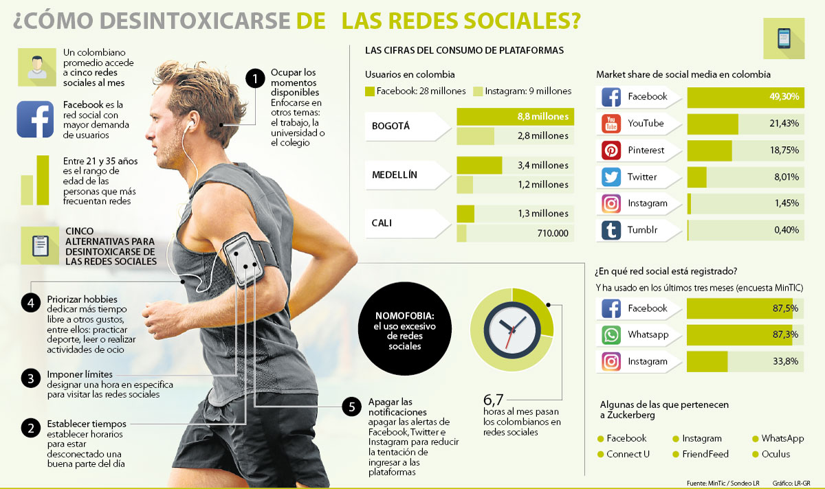 Los efectos nocivos de las redes sociales no son solo físicos, sino también mentales. Aunque el índice de consumo de plataformas digitales en Colombia está, en promedio, en 6,7 horas al mes, expertos aclaran que llevarlo a los excesos podría causar alteraciones nerviosas, problemas de sueño y depresión. Pero, ¿cómo desintoxicarse de las plataformas digitales?