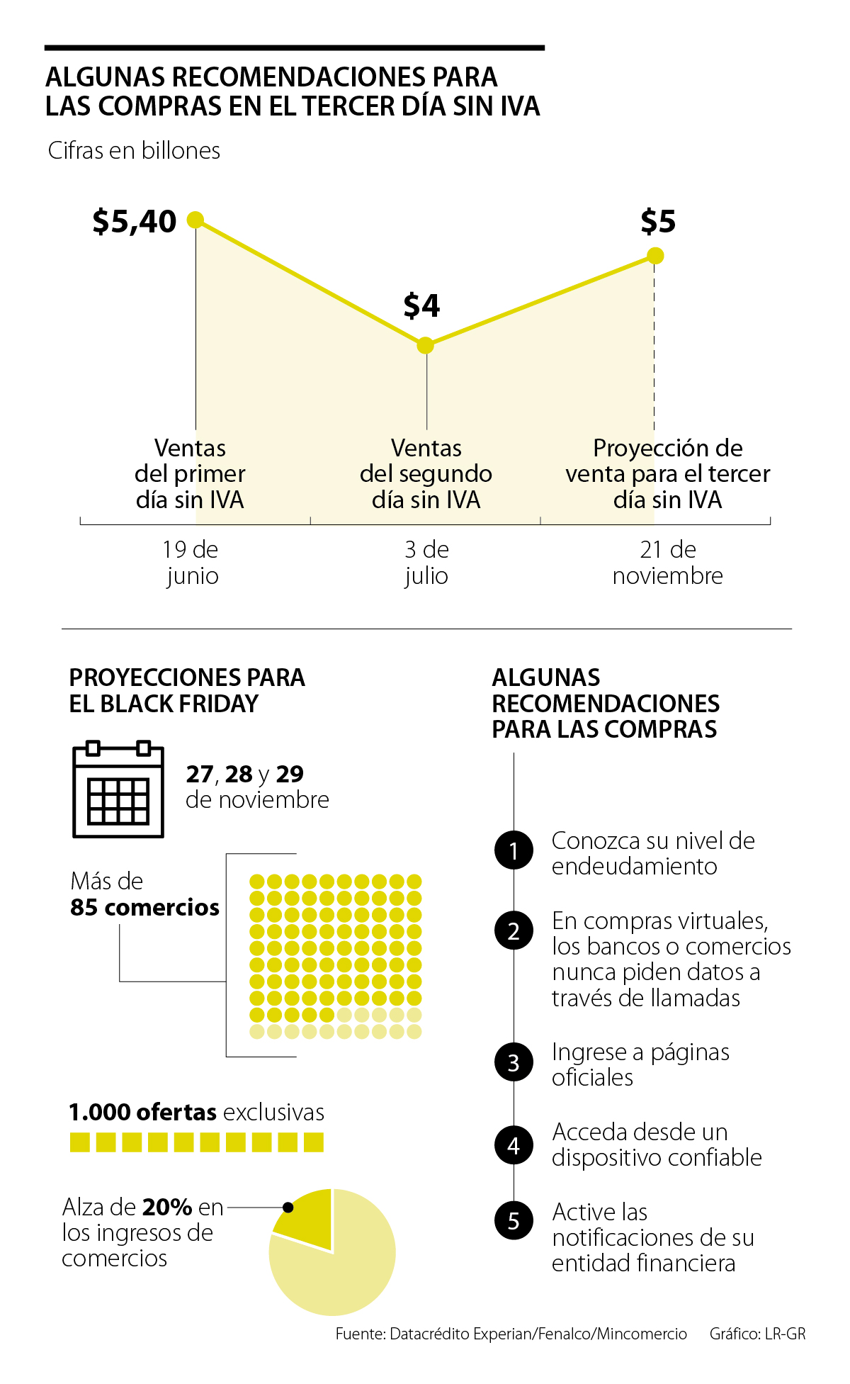 Uno de los aspectos más importantes de esta jornada será el comercio electrónico, por lo que LR le entrega recomendaciones para que tenga en cuenta cuando vaya a realizar una transacción de este tipo. En principio, según Datacrédito Experian, lo más importante es que, antes de utilizar su tarjeta de crédito o débito, conozca su nivel actual de endeudamiento, cupo disponible, fechas de corte y gastos venideros o imprevistos para evitar colapsar su capacidad de pago.