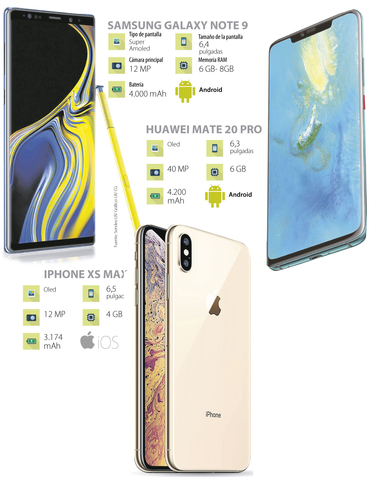 LR hizo un sondeo comparando los buque insignia de estas marcas, y analizó aspectos clave para un consumidor de a pie como resolución y tamaño de pantalla, cámara, batería, actualizaciones y memoria RAM.