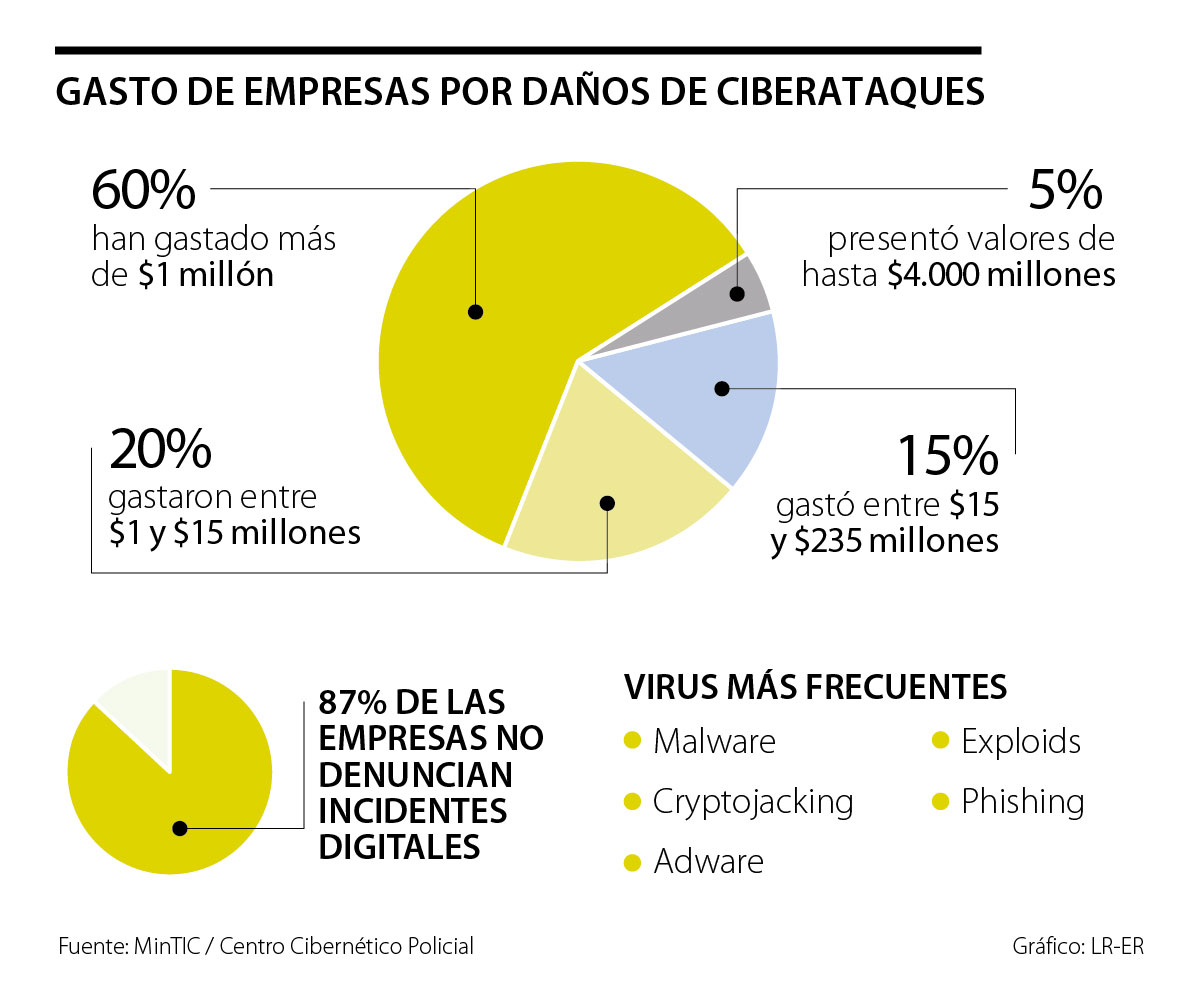 De acuerdo con un estudio realizado por el Ministerio de Tecnologías de la Información y Comunicaciones, la Organización de los Estados Americanos (OEA) y el Banco Interamericano de Desarrollo (BID), más de 60% de las empresas locales encuestadas incurrieron en costos cercanos a $1 millón por daños relacionados con ciberataques, mientras que 20% gastaron entre $1 millón y $15 millones, 15% entre $15 millones y $235 millones y 5% invirtió valores de hasta $4.000 millones.
