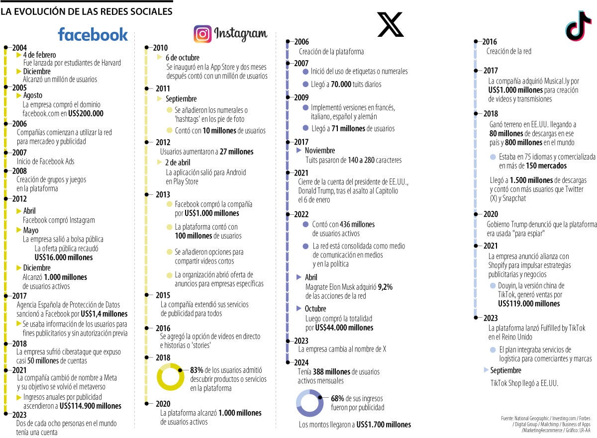 YouTube, Twitter, WhatsApp, Instagram, Snapchat y TikTok se convirtieron en hábitos cotidianos para millones de personas en todo el planeta. Y quizás lo que nació como una plataforma para estudiantes de prestigiosas universidades norteamericanas fue transformándose, con el paso del tiempo, en un conjunto de grandes conglomerados de negocios, navegando entre el mercadeo, la publicidad y el comercio electrónico.