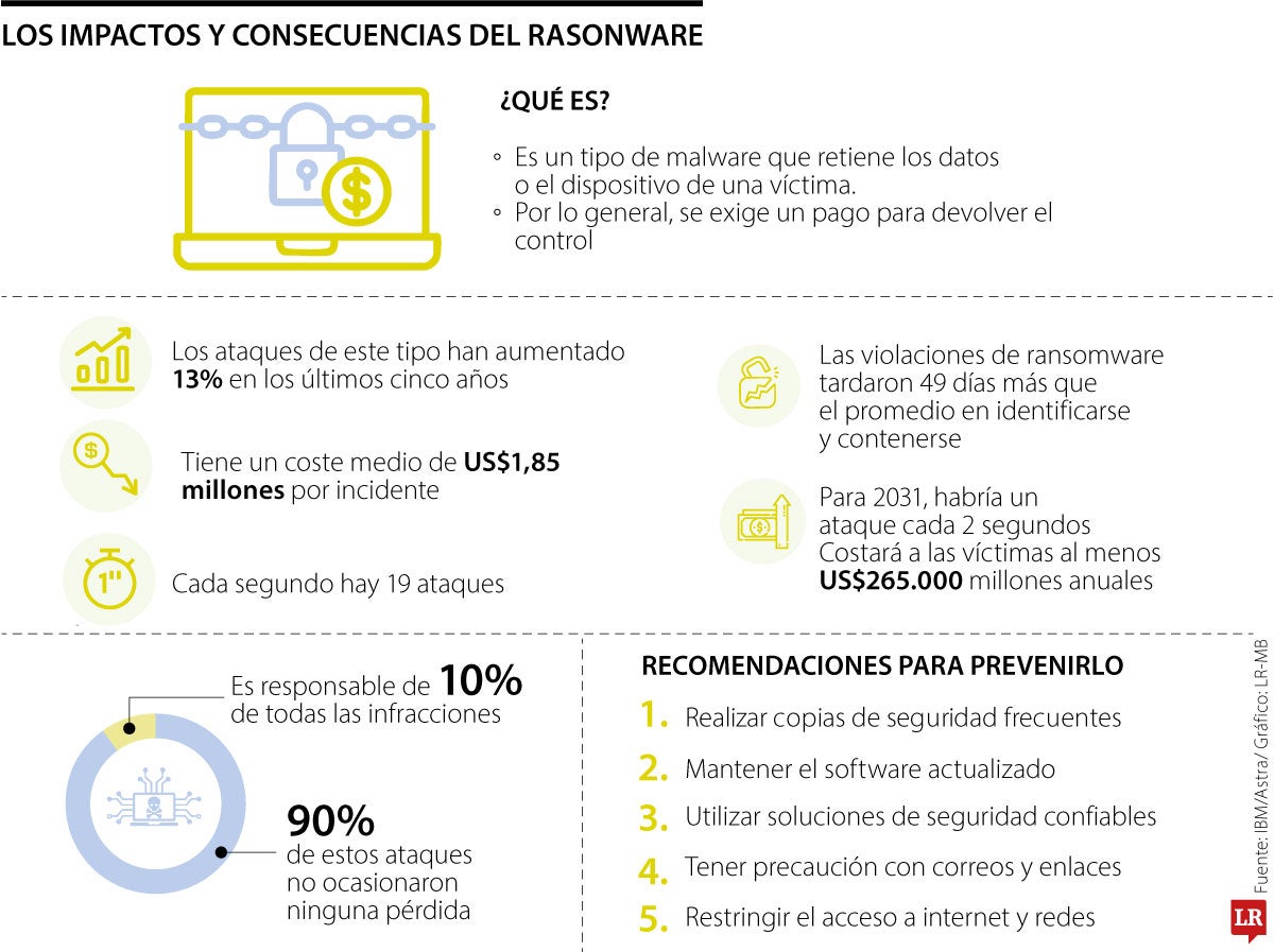 El ransomware es un tipo de malware que retiene los datos o dispositivos de una víctima, a quien se le pide un rescate para la liberación de la información o de la unidad. Según IBM, los ataques de este tipo en los últimos años evolucionaron para incluir tácticas de doble y triple exposición. Astra, además, dijo que este delito creció 13% en los últimos cinco años.