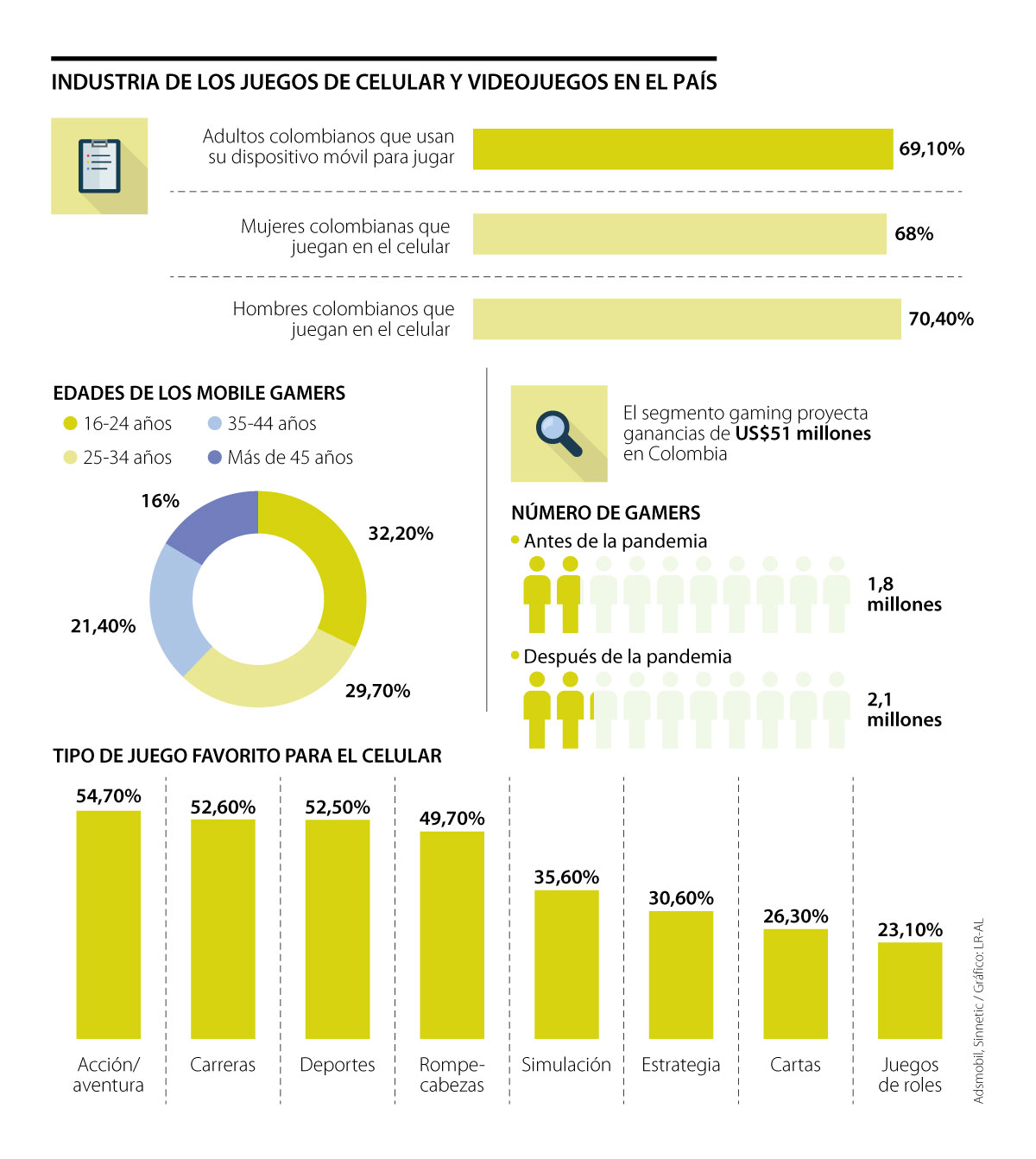 La empresa de investigación y Big Data, Sinnetic, publicó un estudio sobre el gaming en Colombia y uno de sus hallazgos principales fue que antes de la cuarentena había 1,8 millones de jugadores activos en el país y desde marzo la cifra ascendió a 2,1 millones. Además, indicó que este segmento de entretenimiento generaba ganancias anuales en Colombia de US$51 millones.