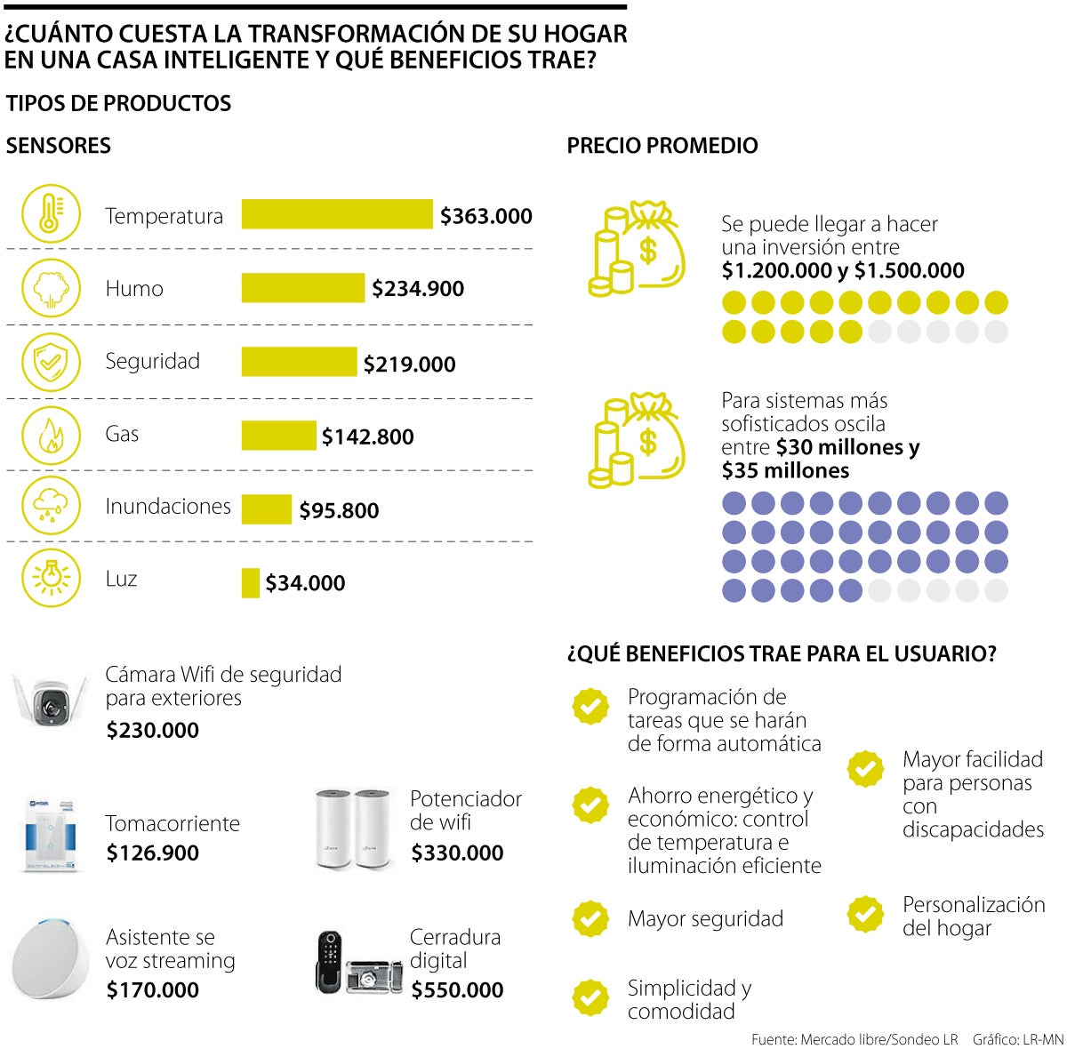 “En la actualidad existe una variada oferta que permite instalar componentes básicosde control domótico, tales como sensores, cámaras, tomacorrientes, bombillas, entre otros; y puede estimarse una inversión entre $1,2 a $1,5 millones. Sin embargo, el rango puede ampliarse a sistemas más sofisticados que pueden requerir inversiones que oscilen entre $30 a $35 millones”, agregó Juan Manuel Perea, director de proyectos en NyBa Group y profesor de la Universidad Javeriana.