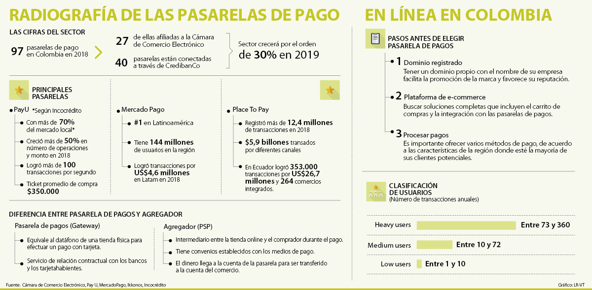 De acuerdo con datos de la Cámara Colombiana de Comercio Electrónico (CCE), este tipo de plataformas ya alcanzan a ser 97 en el país, a cierre de 2018, un crecimiento de 53,9% desde la cifra anterior que manejaba la entidad de cerca de 63 pasarelas de pago. De estas, 27 están afiliadas a la CCE, mientras las otras funcionan independientes.