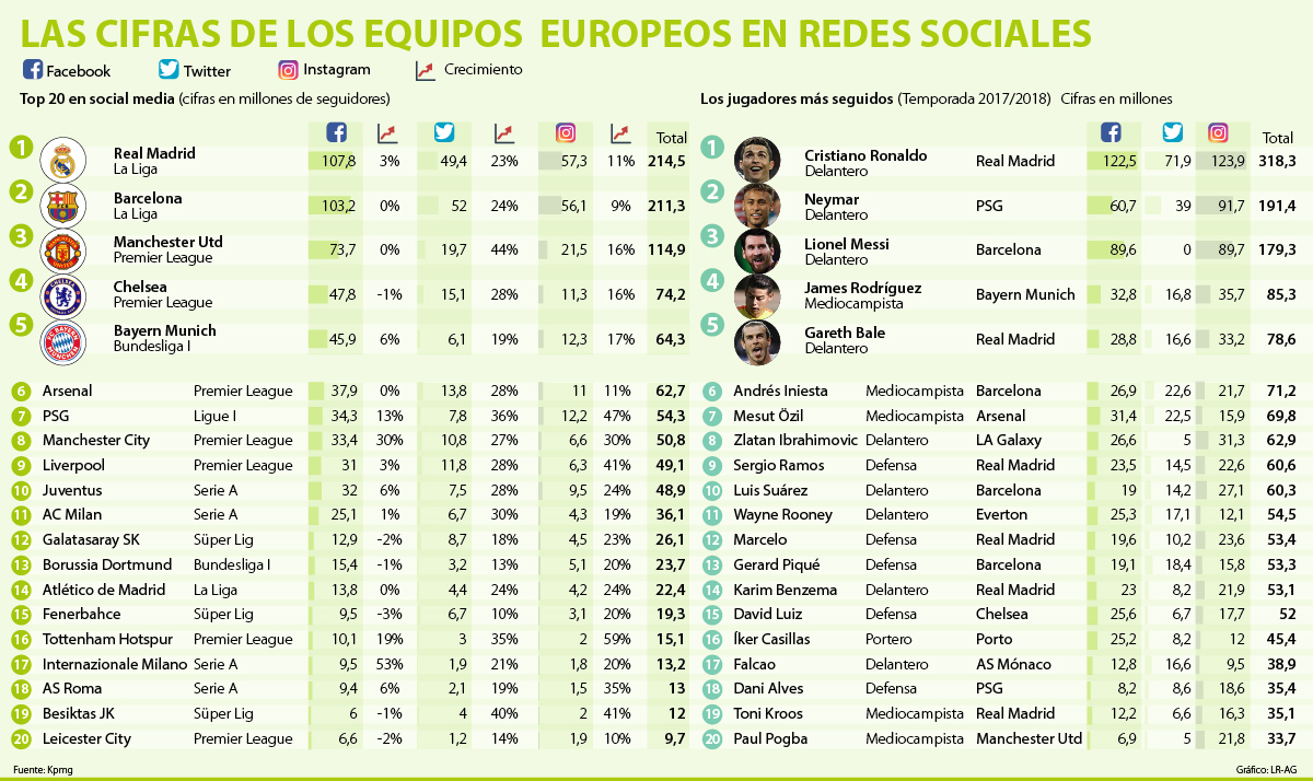 Pero este modelo no solo aplica para los equipos, también para los jugadores. El informe de Kpmg también destaca a los futbolistas más codiciados en las plataformas sociales durante el periodo de referencia del estudio. Cristiano Ronaldo, Neymar, Lionel Messi, James Rodríguez y Gareth Bale son los astros que más se mueven entre las redes.