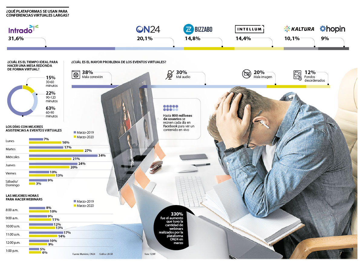 Los eventos digitales son la nueva normalidad; según la plataforma para webinars ON24, las conferencias web alojadas en la herramienta subieron 330% en marzo
