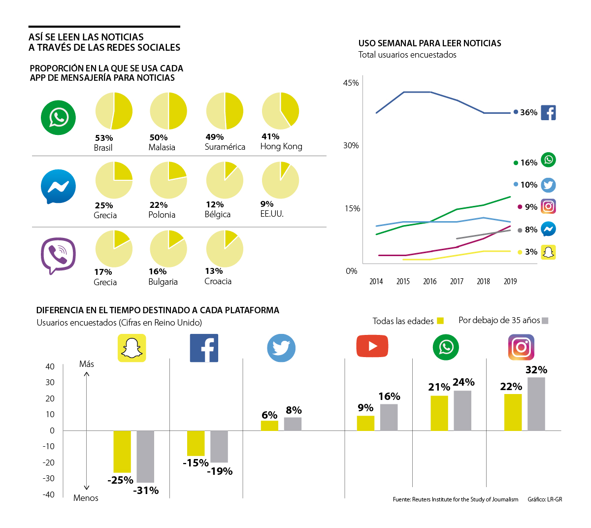 Según la estadística de uso semanal para informarse, 36% de los usuarios encuestados usan Facebook, una tendencia que se ha mantenido en los últimos cinco años. Le sigue WhatsApp, con 16% de lectores, Twitter, con 10%; Instagram, con 9%; Messenger, con 8%, y Snapchat, con 3%.