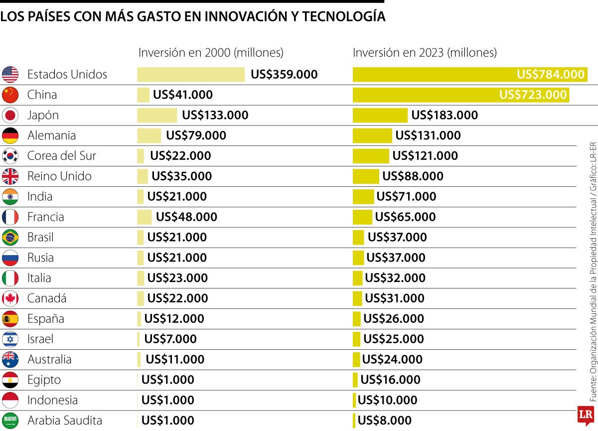 El documento compara los recursos dirigidos a este fin entre 2000 y 2023 y se encontró que casi se triplicó el dinero invertido en I+D. “A pesar de tres grandes crisis económicas, una pandemia y las continuas tensiones geopolíticas, se ha triplicado y pasó de US$1 billón en 2000 a más de US$2,75 billones en 2023”, aseguró la Ompi.