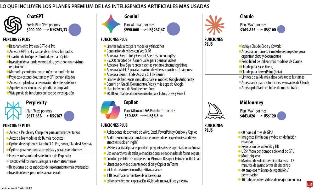 Las suscripciones mensuales a los planes más avanzados de ChatGPT, Gemini, Cloude, Perplexity, Copilot y MidJourny oscilan entre $30.833 y $990.000