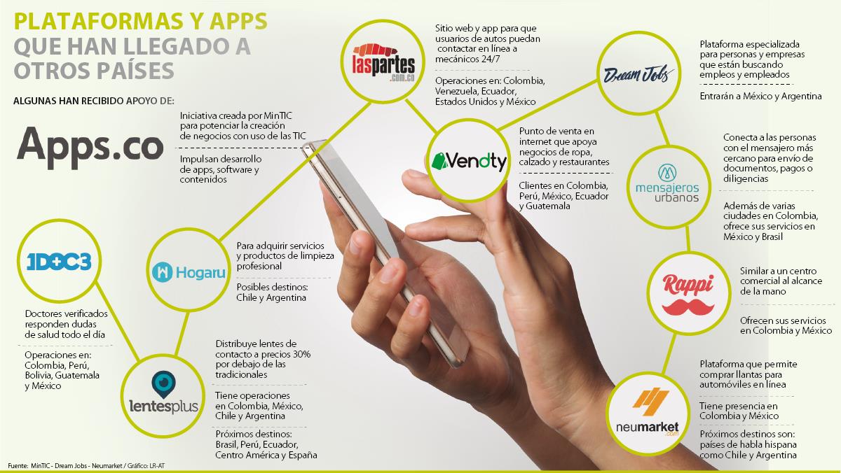 Sin embargo, muchas veces no es necesario viajar a EE.UU. para poder impulsar una idea y esto es lo que han demostrado apps y plataformas 100% colombianas, como 1Doc3, Lentesplus.com, Hogaru, Laspartes, Mensajeros Urbanos, Neumarket, Dream Jobs, Rappi, entre otras, al desarrollarse en el país y después tocar nuevas tierras alrededor del mundo.