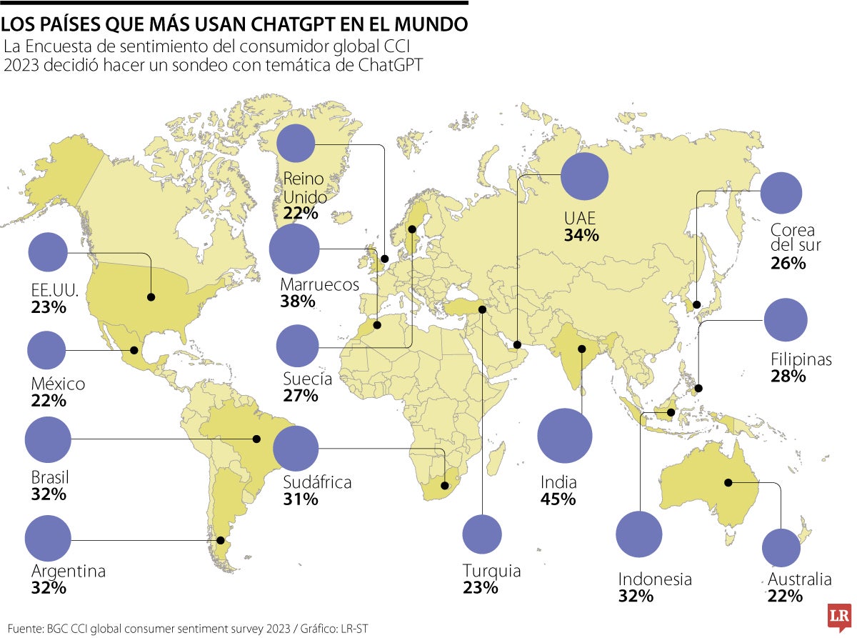 La Encuesta de Sentimiento del Consumidor Global CCI 2023 decidió investigar cuales son los países que tienen un mayor uso de esta IA. En primer lugar se encuentra India con 45%, seguido de Marruecos con 38% y Emiratos Árabes Unidos (EAU) con 34%.