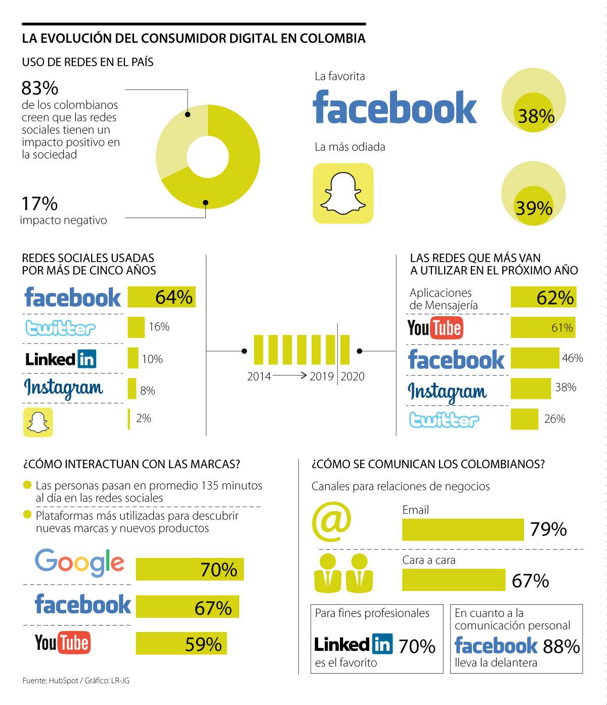 De acuerdo con Carolina Samsing, directora de marketing para América Latina de HubSpot, el estudio arrojó que “en Colombia, Facebook sigue siendo la red social favorita para los usuarios con 38% de preferencia. Es la red utilizada hace más de cinco años, de las que generan más confianza y de las que se espera utilizar más en los próximos años”.