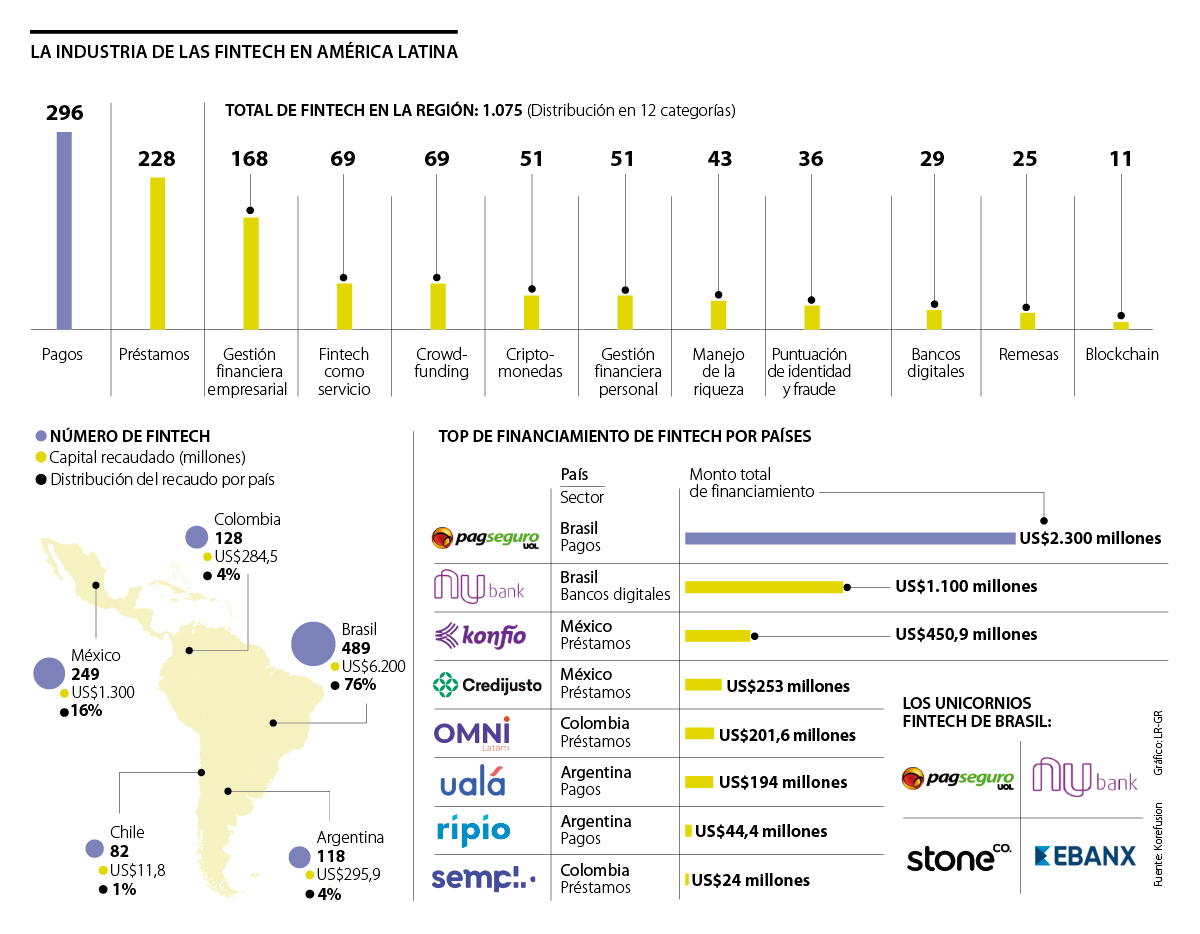 En América Latina, se ha visto un especial crecimiento de esta industria y ya hay más de 1.075 fintech en todos los países de la región; Brasil es el más fuerte con más de 489 entidades y un capital recaudado que alcanza los US$6.200 millones.