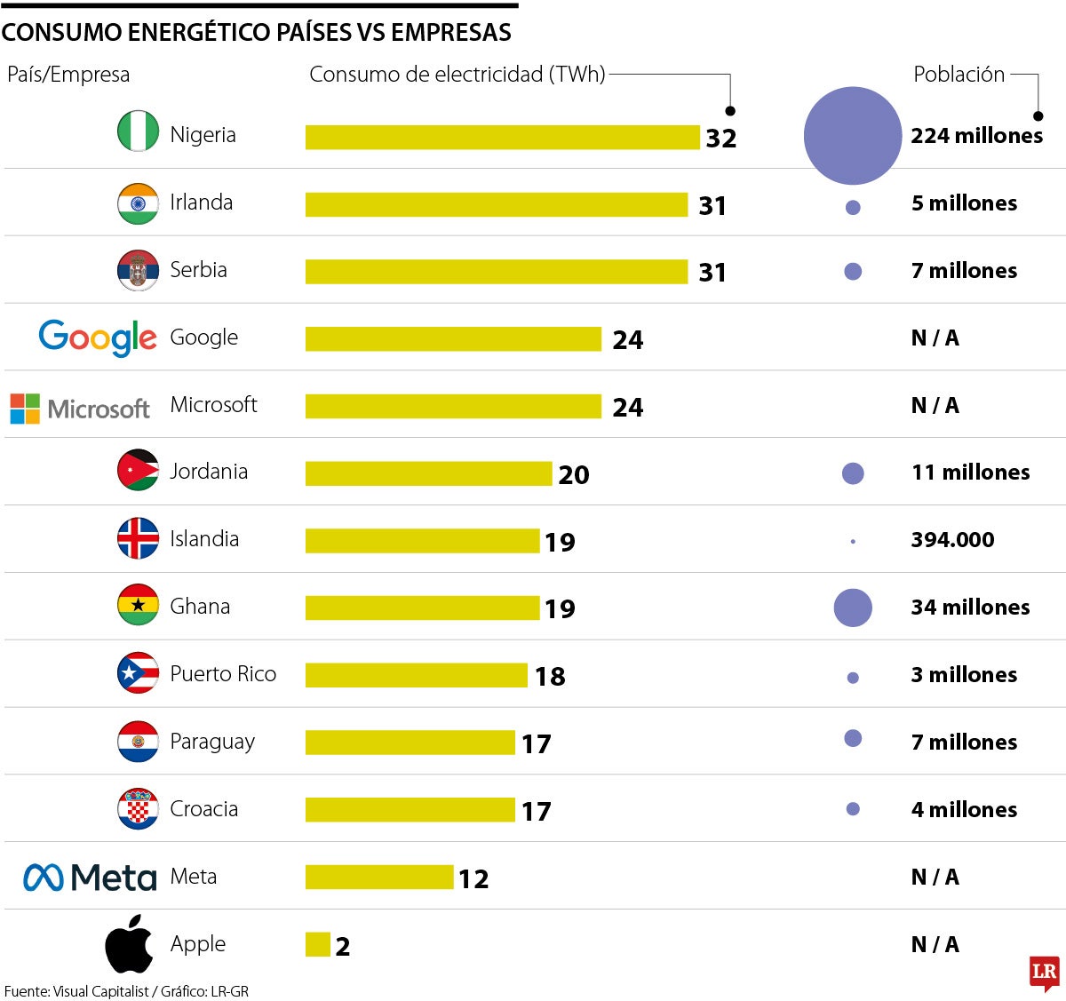 Un estudio publicado por Visual Capitalist reveló que las empresas tecnológicas más grandes del mundo utilizan iguales o mayores cantidades de energía que muchos países. La IA y sus centros de datos son una de las herramientas que más gasto energético generan. El listado de la página web está compuesto por diversos países y el consumo de electricidad está medido en teravatio-hora (TWh). Nigeria, por ejemplo, tiene una población de 224 millones de personas, lo cual arroja un consumo de TWh de 32; Irlanda, con cinco millones de habitantes, tiene un consumo de 31 TWh, así como Serbia que, con siete millones de personas, genera una demanda de alrededor de 31 TWh también.