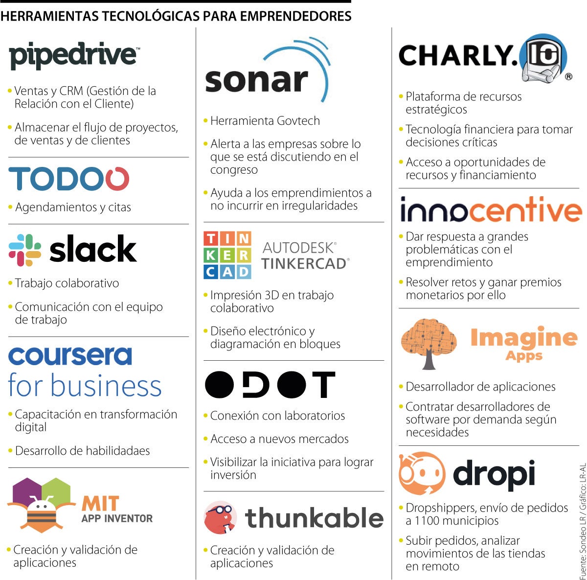 Para estas tecnologías que se deben incorporar al modelo de negocio sería necesario tener a un desarrollador en el proceso, pero hay algunas herramientas tipo aplicación que se pueden simplemente descargar y utilizar; iniciando por WhatsApp Business, o plataformas gratuitas, con gratuidad por tiempo limitado, o versiones premium con la metodología de Business Model (modelo de negocio) en las que se puede hacer lluvia de ideas sobre un proyecto.