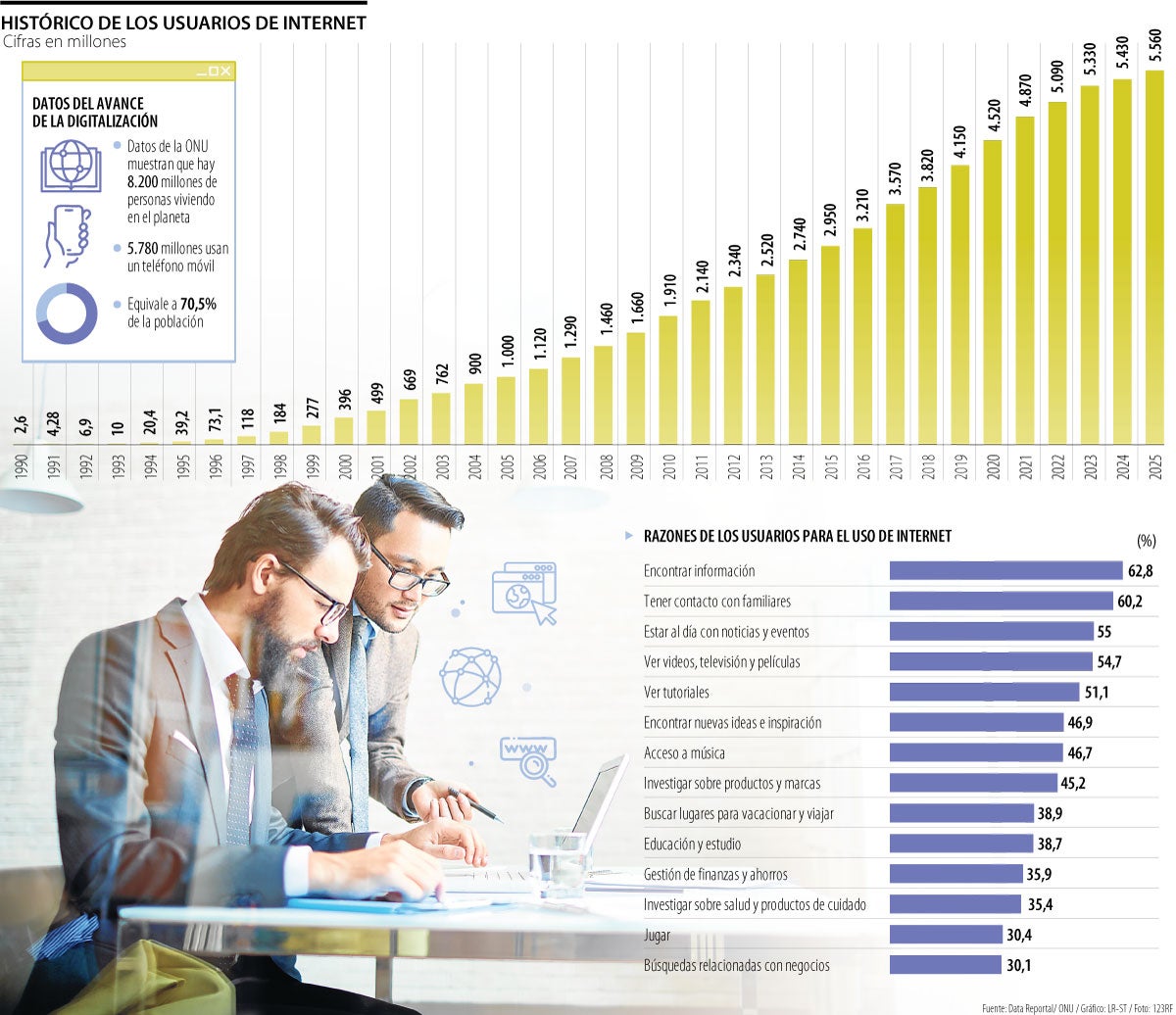 Desde 1990, los usuarios han pasado de 2,6 millones a 5.600 millones; la búsqueda de información es la principal razón motivación de las personas para navegar