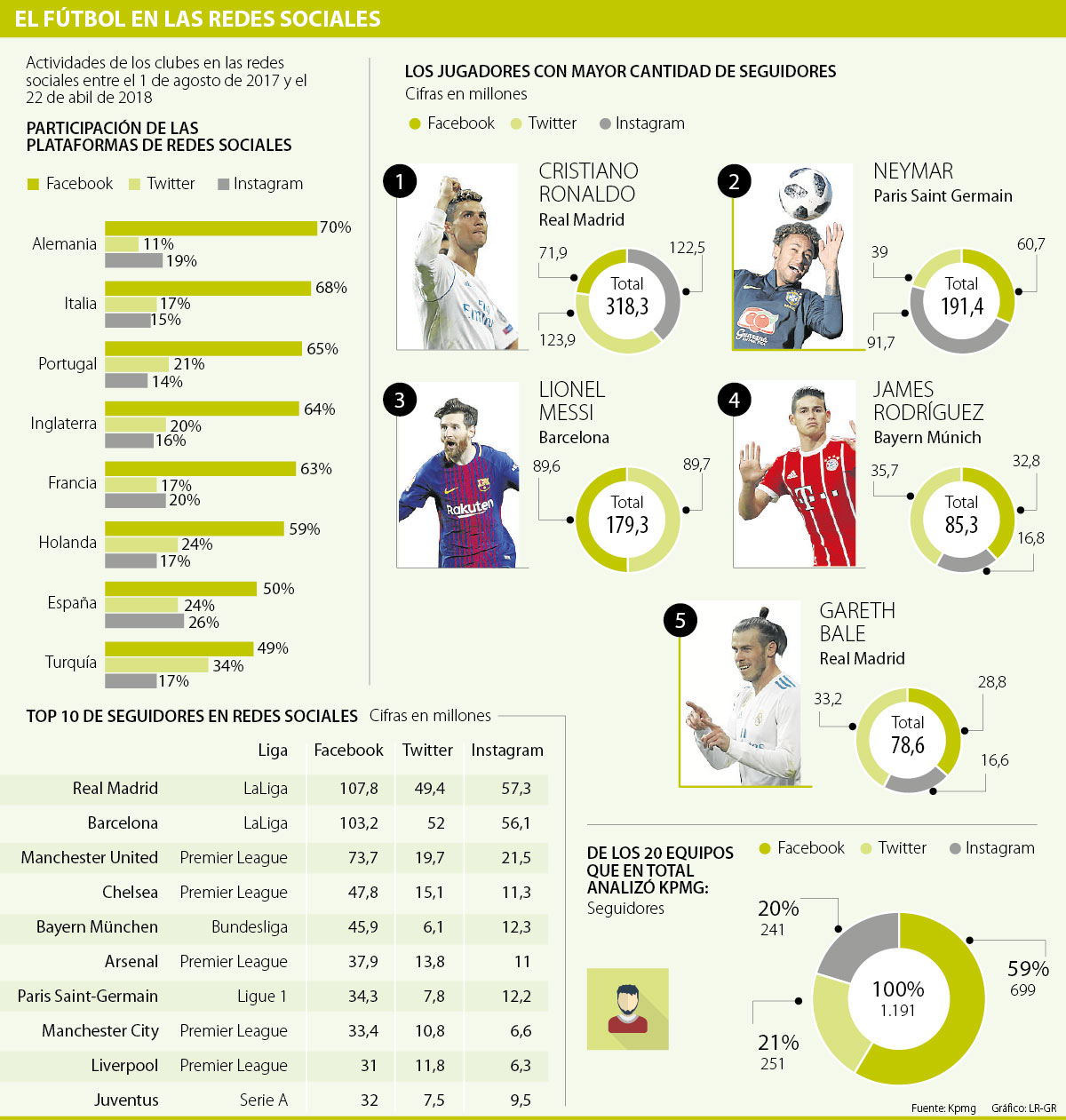 La consultora, que tiene una división específica para estudiar la industria del fútbol, analizó el número de seguidores de los principales equipos y jugadores del mundo en Facebook, Twitter e Instagram entre el primero de agosto de 2017 y el 22 de abril de 2018. En ese período y en esas tres plataformas, James tuvo 85,3 millones de seguidores: su principal fuente es Facebook, donde tiene 32,8 millones de fans; luego Twitter, con 35,7 millones; y en el caso de Instagram, lo siguen 16,8 millones de cuentas.