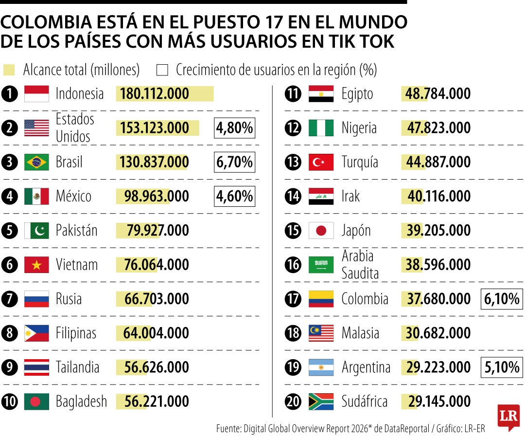 Las cifras recopiladas por DataReportal a corte de octubre del año pasado mostraron que el país es uno de los 20 con mayores audiencias en Tik Tok