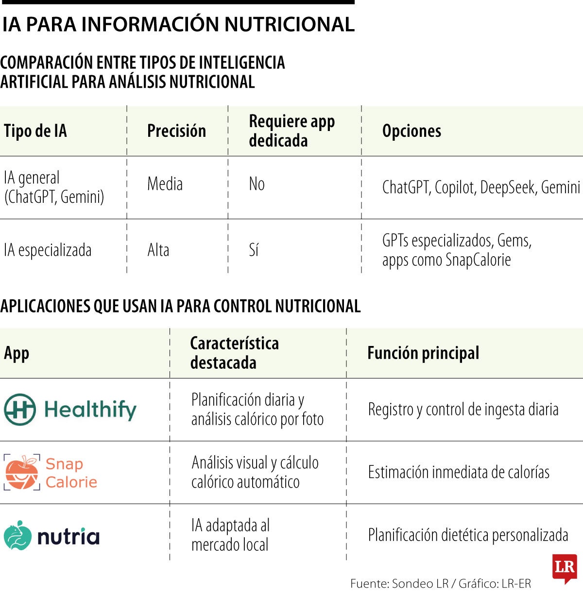Existen también soluciones más especializadas, como SnapCalorie, Healthify o la aplicación chilena NutrIA, que permiten llevar un registro diario de las comidas mediante fotografías, ajustándose a los objetivos personales del usuario. Estas apps pueden generar planes nutricionales, calcular el total de calorías consumidas y ofrecer recomendaciones personalizadas con base en datos personales.