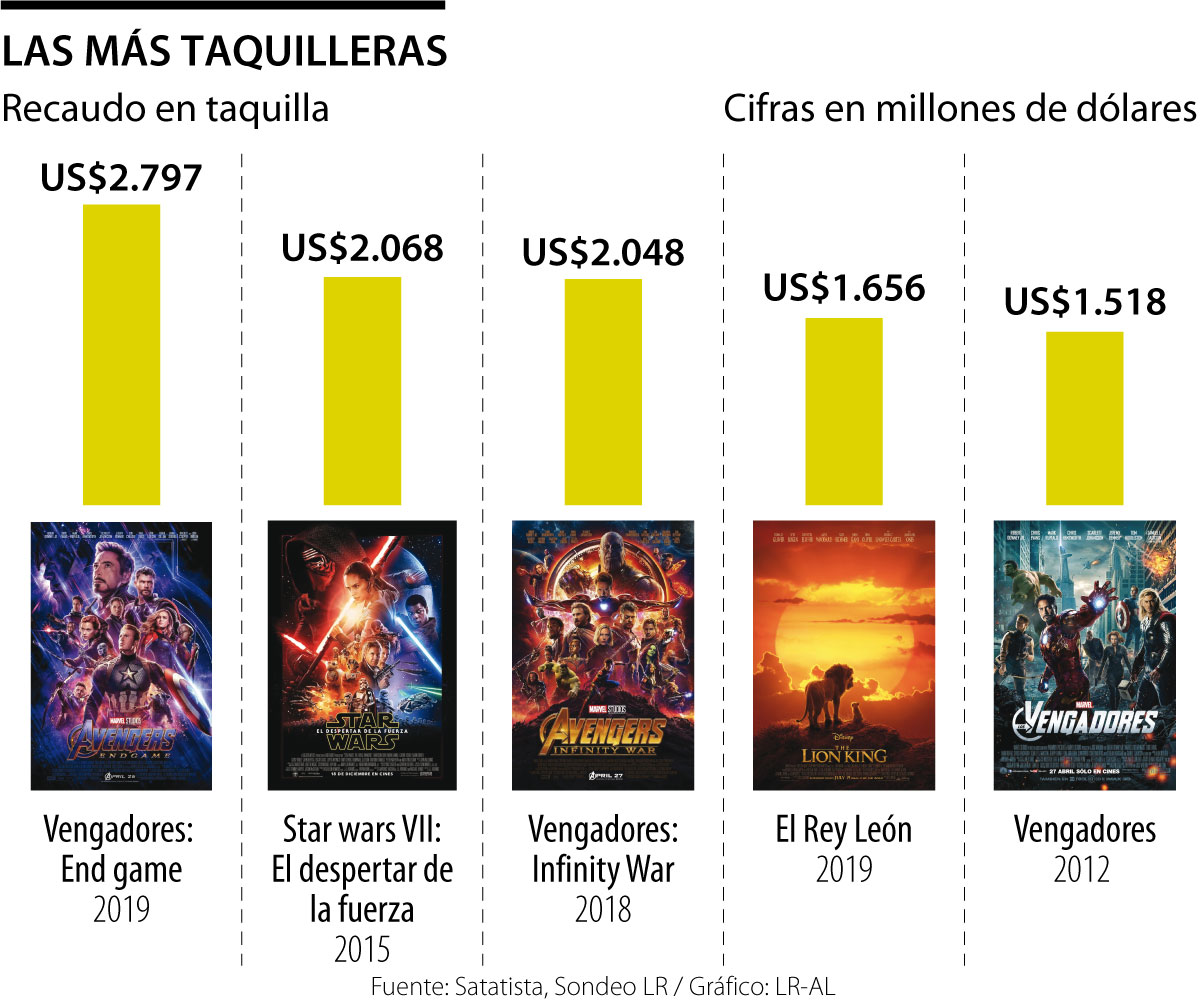 Primero, especial para los amantes del Universo Cinematográfico de Marvel (UCM), se encuentra ‘Vengadores: End Game’, la película logró recaudar US$2.797 millones.