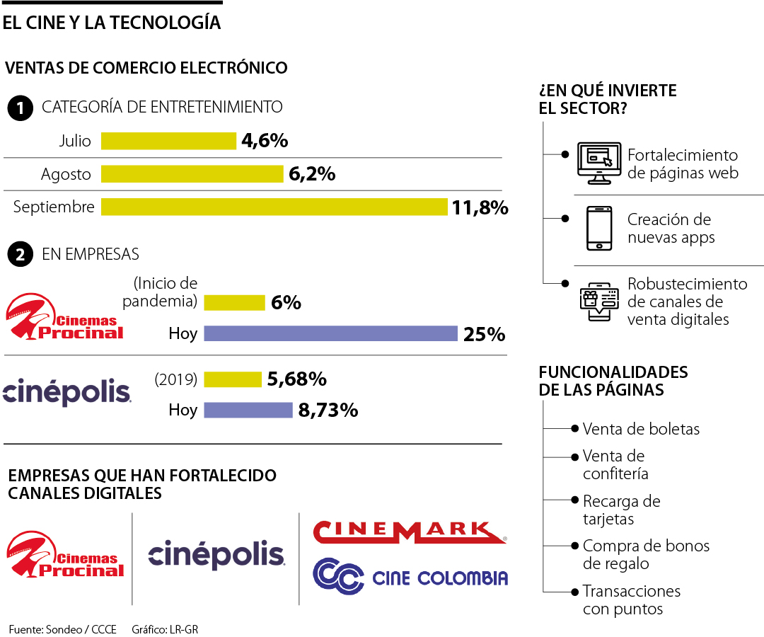 De acuerdo con la Cámara Colombiana de Comercio Electrónico (CCCE), la categoría de entretenimiento continúa creciendo con variaciones de 4,6%, 6,2% y 11,9% en julio, agosto y septiembre, respectivamente, “influenciada por las reaperturas de cines y teatros desde principios del trimestre anterior”.