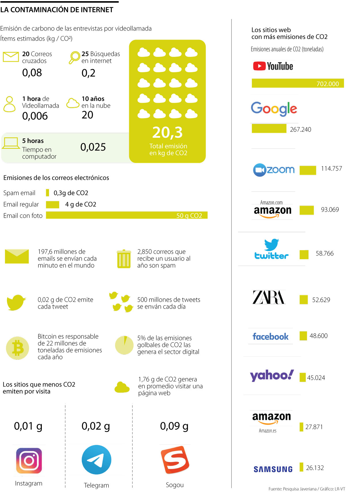 De acuerdo con Pesquisa Javeriana, la publicación científica de la Pontificia Universidad Javeriana, el promedio de CO2 que se produce por visitar una página web es de 1,76 gramos, lo que genera en un año una página con 10.000 visitas, alrededor de 211 kg de dióxido de carbono.