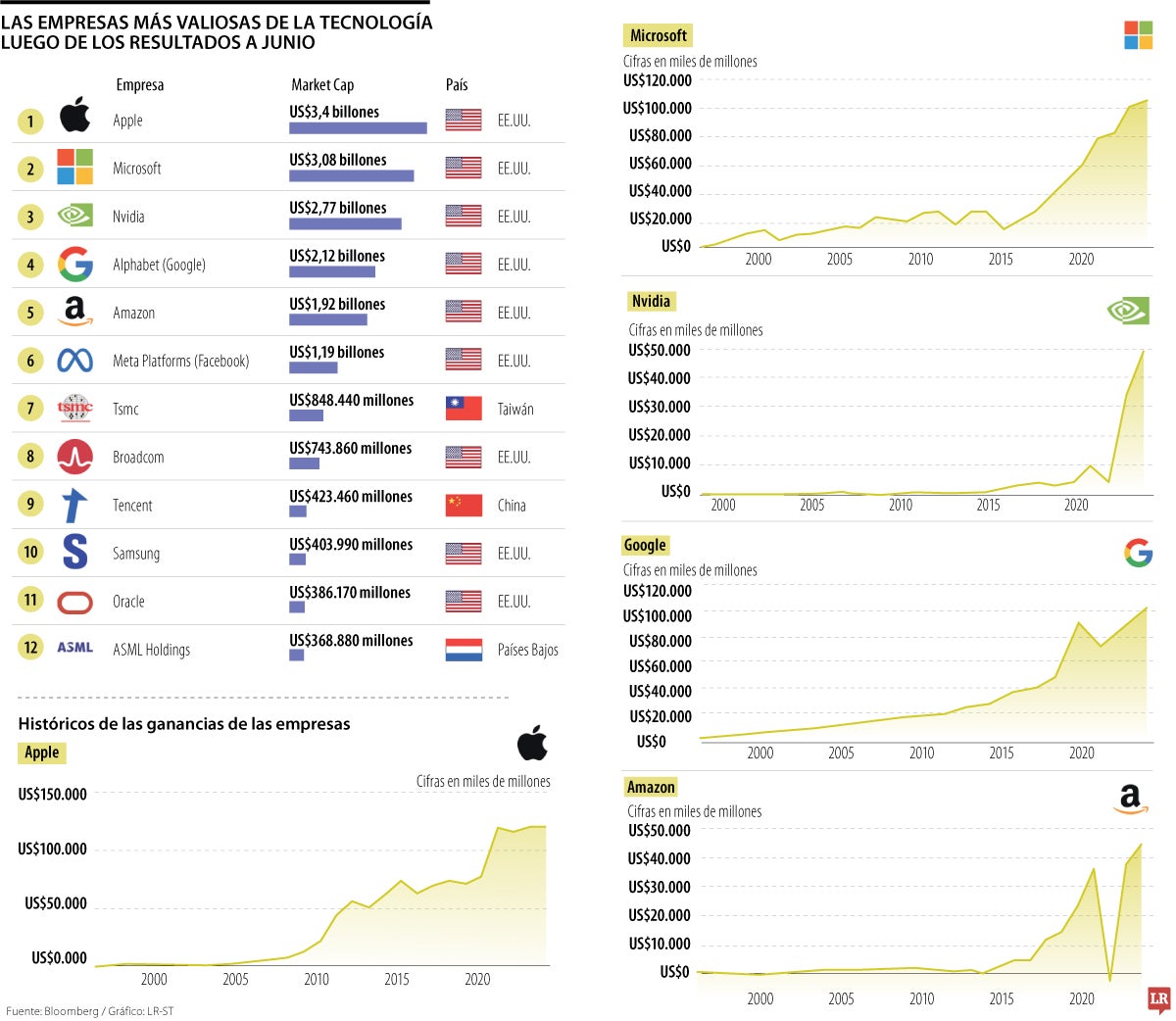 China, Taiwán y Países Bajos están dentro de este listado con sus organizaciones. Después de revelar su desempeño financiero, Apple está a la cabeza del top, seguido de Microsoft, Nvidia, Alphabet y Amazon. Meta Platforms (Facebook), Tsmc, Tencent, Broadcom, Samsung, Oracle y Asml Holdings completan el listado de las mejor valoradas.