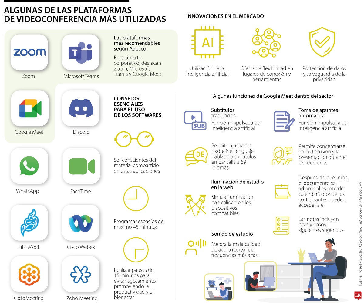 “Tras la llegada de la pandemia por covid-19, surgieron diversas plataformas que continúan vigentes y con gran presencia en el mercado. En el ámbito corporativo, destacan tres principales: Zoom, Microsoft Teams y Google Meet; estas herramientas siguen siendo las más utilizadas en las empresas, aunque algunas organizaciones también cuentan con soluciones internas. No obstante, en términos generales, estas son las que lideran el sector”, destacó Andrés Alvarado, director ejecutivo de LHH Colombia, empresa del Grupo Adecco.