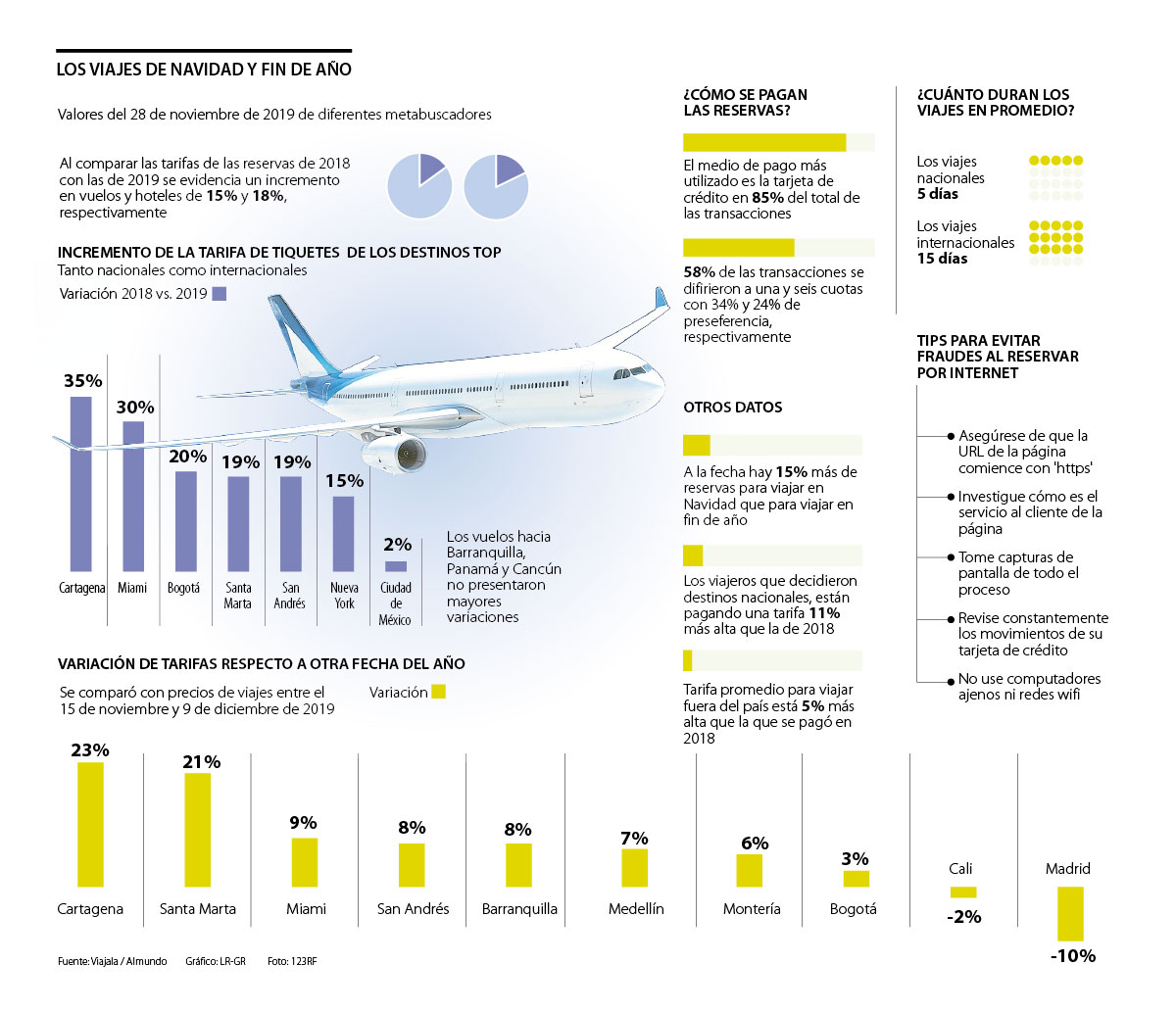 Recuerde que los destinos con mayor demanda también tendrán un aumento en sus precios. Según Viajala, entre el 15 de diciembre de 2019 y el 6 de enero de 2020 los sitios más buscados son: Cartagena, Bogotá, Santa Marta, San Andrés y Madrid. “Los destinos con playa siguen siendo los preferidos de los colombianos para disfrutar las vacaciones de fin de año”, dijo Almundo.