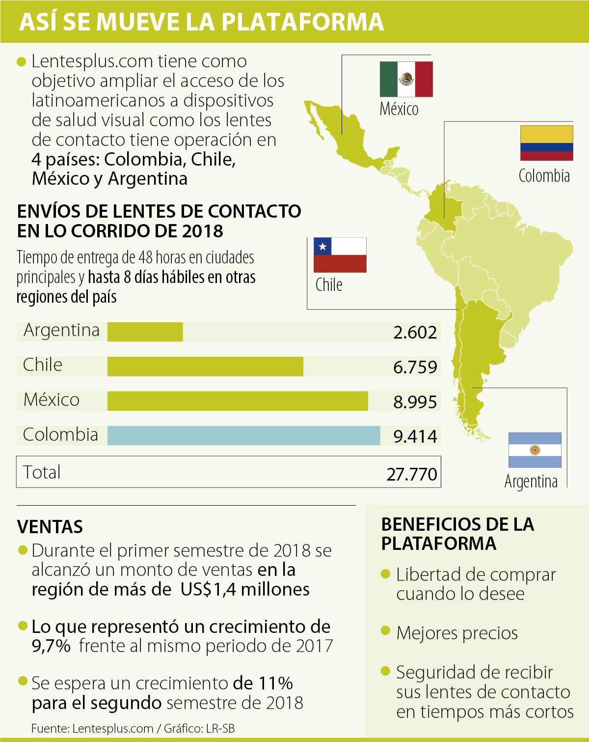 Actualmente, la plataforma Lentesplus.com tiene operación, además de Colombia, en Argentina, México y Chile, países a los que ha hecho en lo corrido de este año 27.770 envíos y donde ha vendido 58.613 productos, con ingresos durante el primer semestre que alcanzaron los US$1,4 millones.