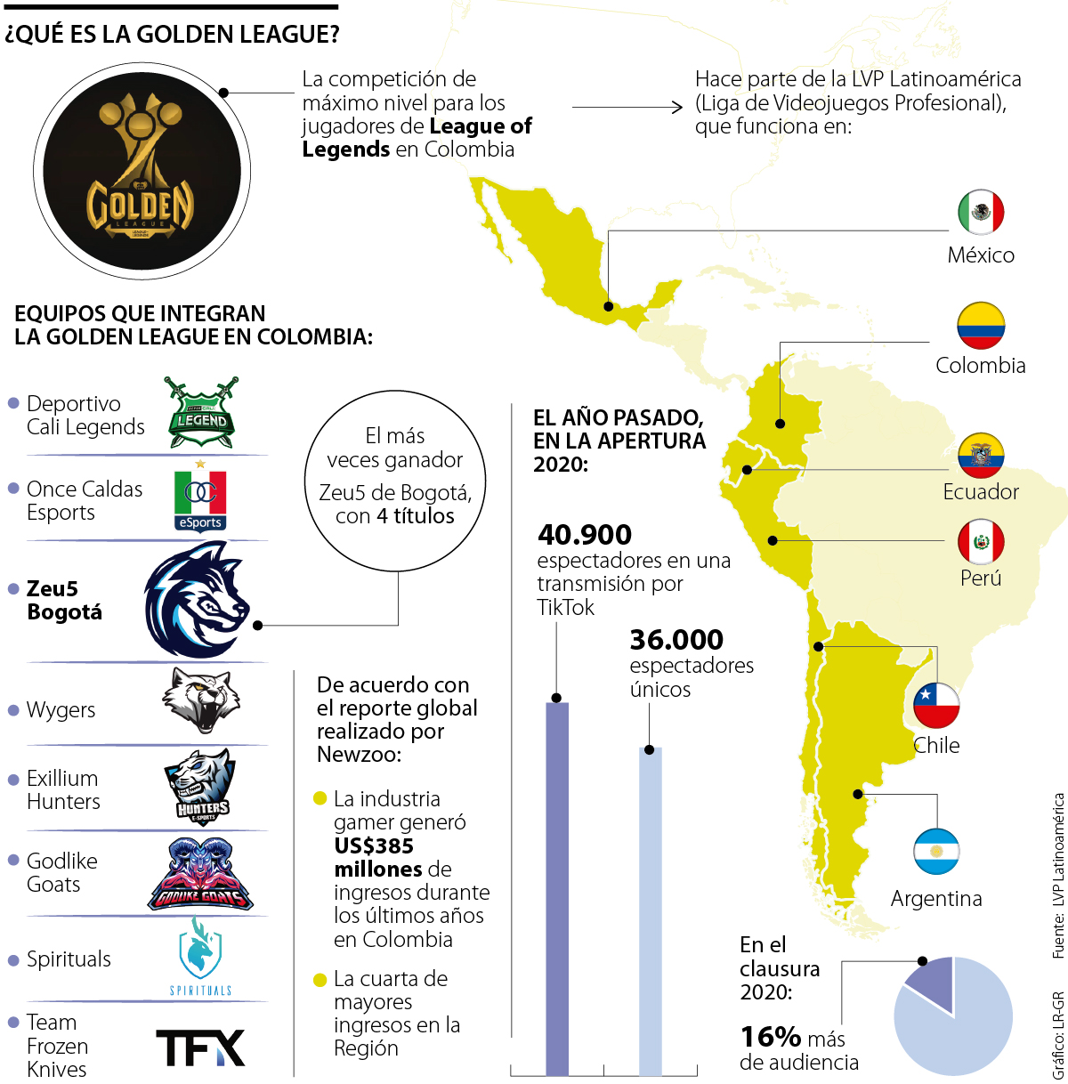 Pero el camino no termina al ser campeones de la Golden League, pues el ganador de esta competición participa en el torneo regional de League of Legends, donde pueden aspirar a obtener un cupo en la LLA, la Liga Latinoamericana, que tuvo más de siete millones de espectadores únicos durante el torneo clausura de 2020.