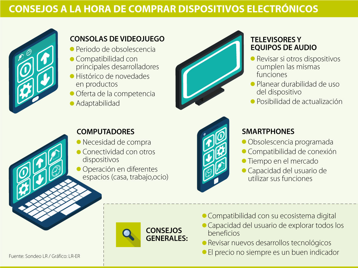 Las características a tener en cuenta a la hora de hacer estas adquisiciones pueden variar dependiendo de la naturaleza del dispositivo, ya sea un smartphone, un computador portátil, una consola de videojuegos o un televisor. En términos generales los consejos se basan en revisar la compatibilidad del dispositivo con su ecosistema digital, la posibilidad como usuario de usar todas las características del sistema y los periodos de obsolescencia programada de la marca.