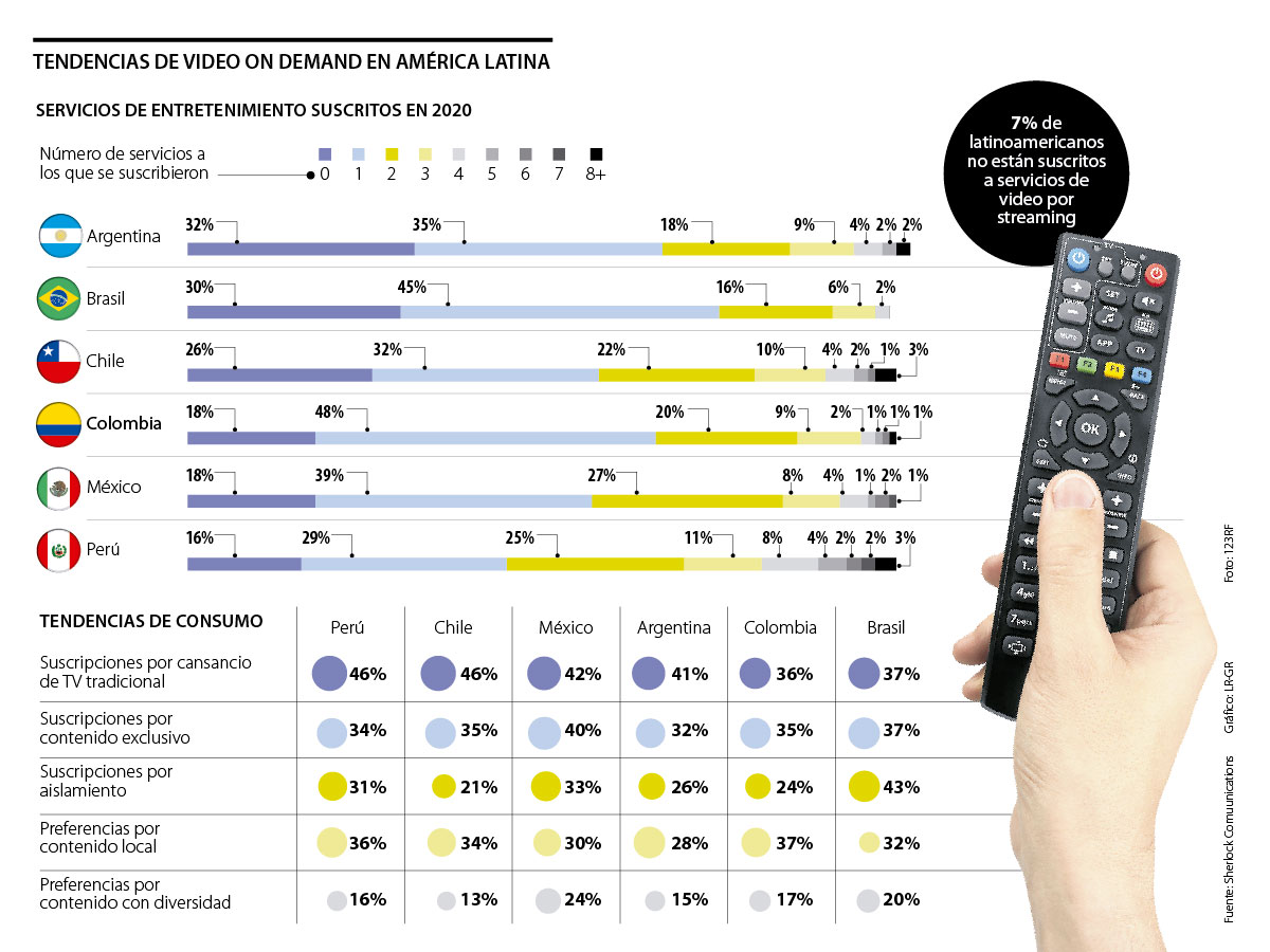 Una de las consecuencias de la pandemia y el aislamiento, de manera transversal en los países de América Latina, fue el crecimiento de los servicios de video-on-demand (vod), un mercado cada vez grande y competido en la región, con grandes jugadores internacionales como Netflix, Amazon Prime y, más recientemente, Disney+.