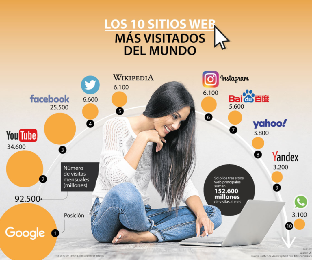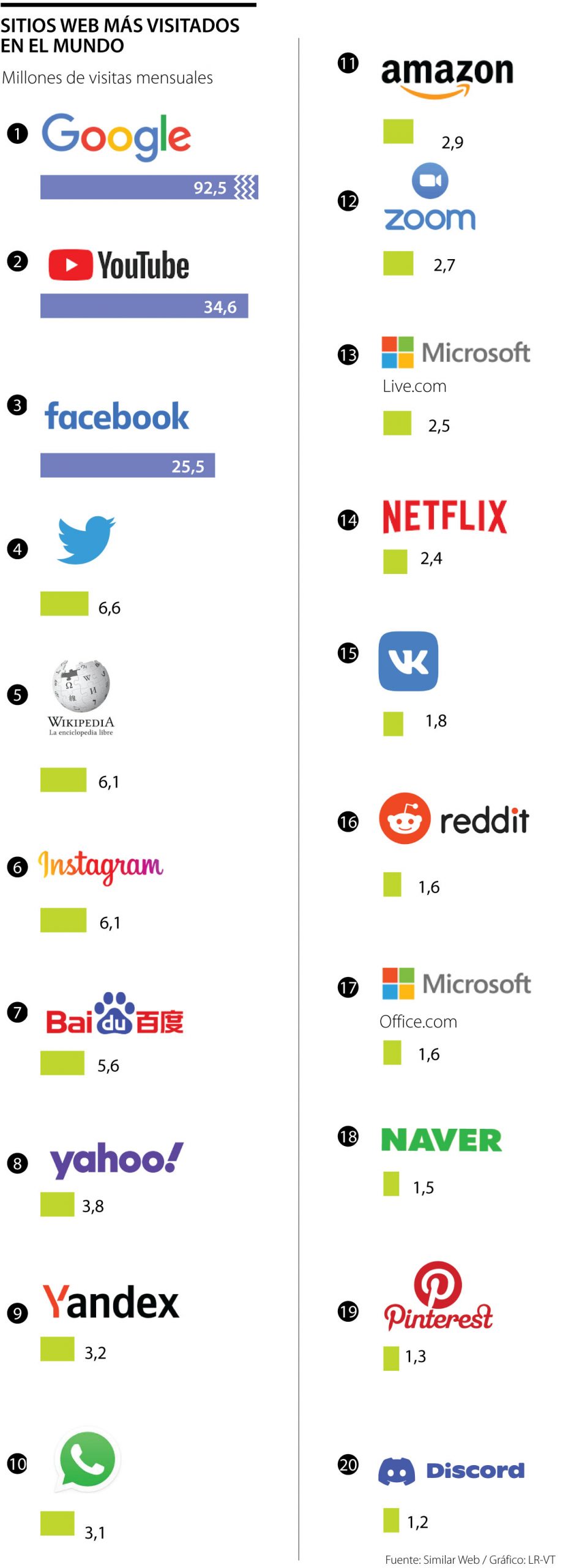 Datos revelados por la firma Similar Web sobre los sitios más visitados por las audiencias en 2020, revelaron que Google encabeza el listado con un registro de 92,5 millones de visitas mensuales; seguido de YouTube, que recibe 36,5 millones de visualizaciones cada 30 días; y de Facebook, que cierra el podio de los preferidos por los internautas, al registrar 25,5 millones de visitas al mes.